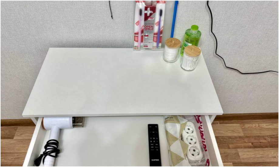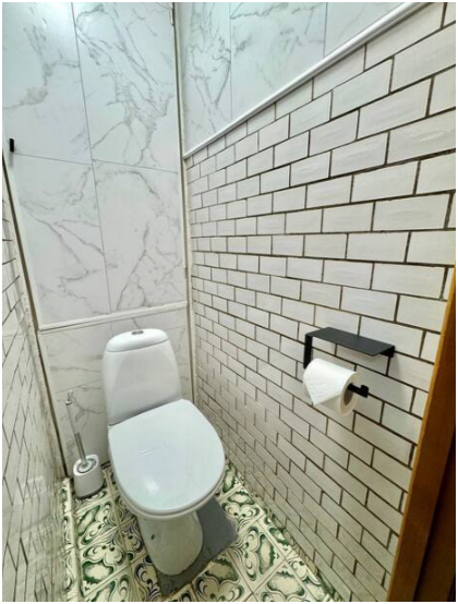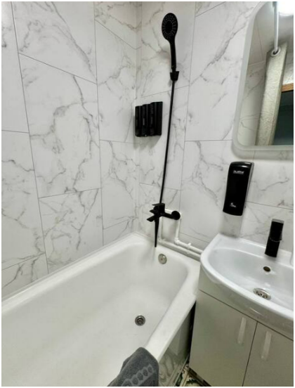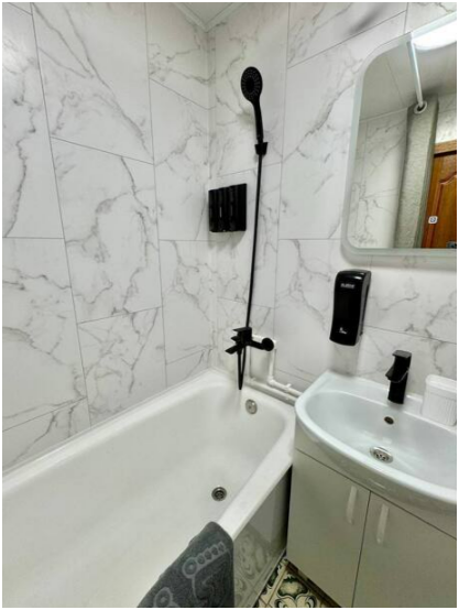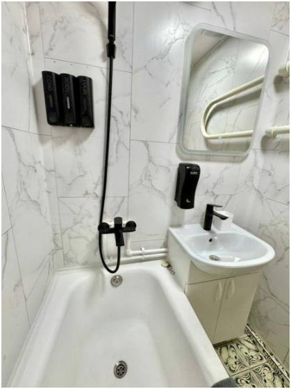 Ванная комната: ванна, стиральная машина, фен, стиральный порошок, средства для мытья посуды, средства гигиены: шампунь, гель для душа, бальзам, жидкое мыло в дозаторах, косметический набор, мицеллярная вода, ватные диски, ватные палочки, крем для рук, зубной набор, одноразовые тапочки.