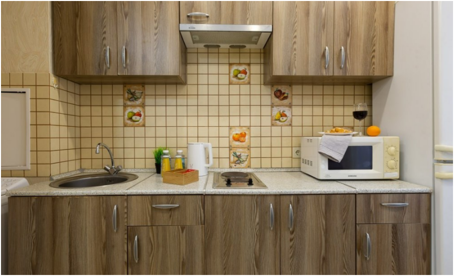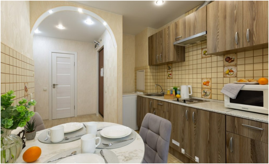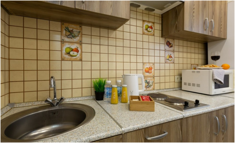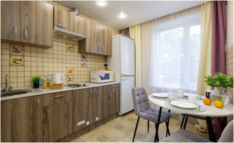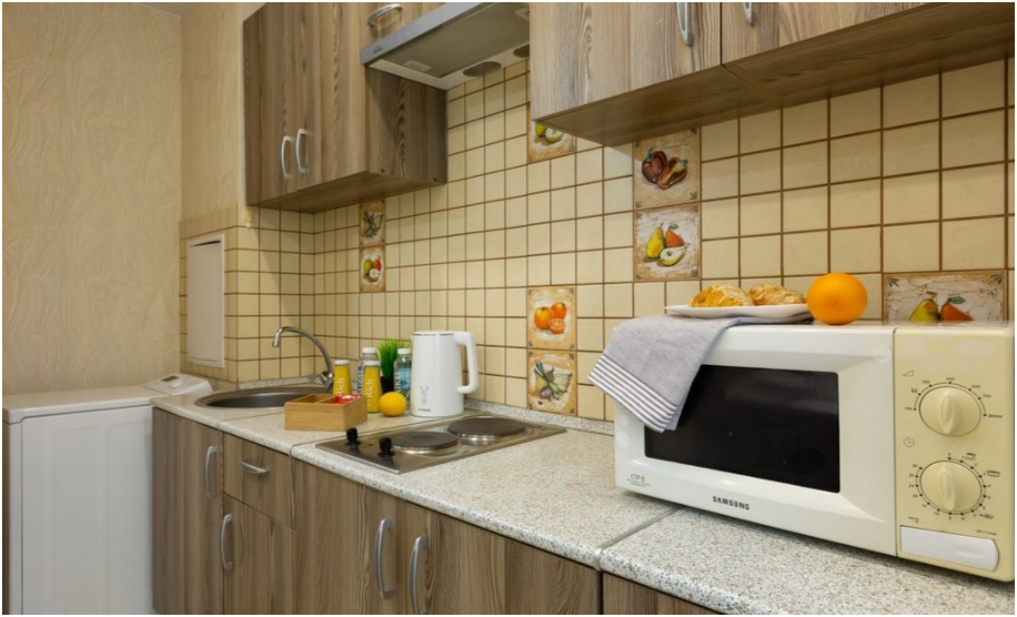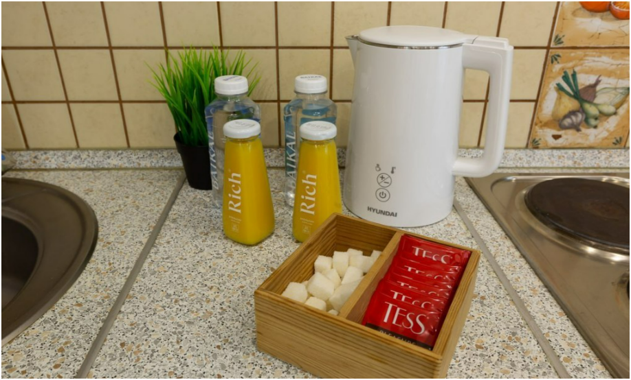 Кухня: плита, микроволновка, вытяжка, чайник, холодильник, мини-бар, набор посуды и все необходимые принадлежности для приготовления пищи, чай/кофе, соль, сахар, растительное масло, специи, минеральная вода.