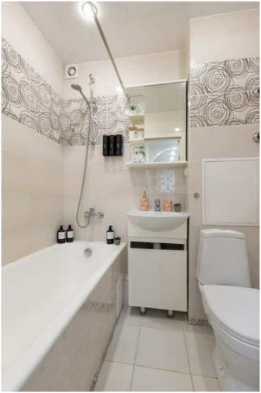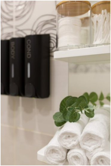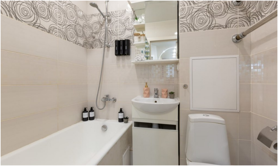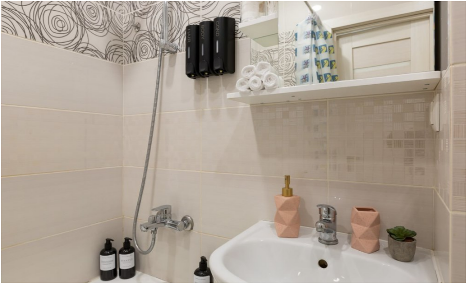 Ванная комната: большая ванна, стиральная машина, фен, стиральный порошок, средства для мытья посуды, средства гигиены: шампунь, гель для душа, бальзам, жидкое мыло в дозаторах, косметический набор, мицеллярная вода, ватные диски, ватные палочки, крем для рук, зубной набор, одноразовые тапочки.