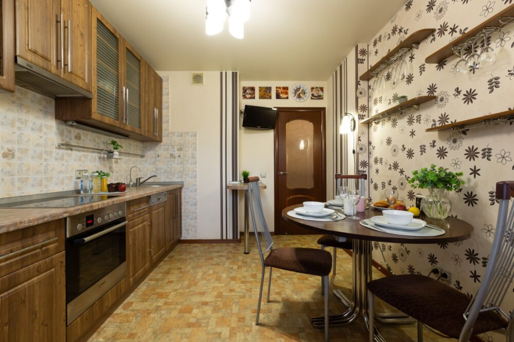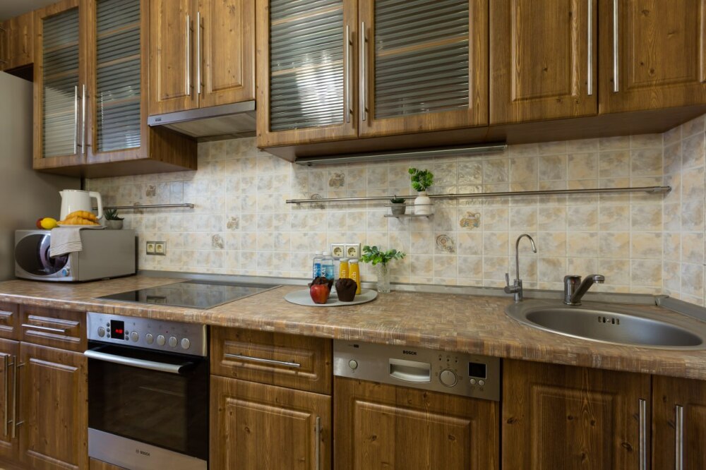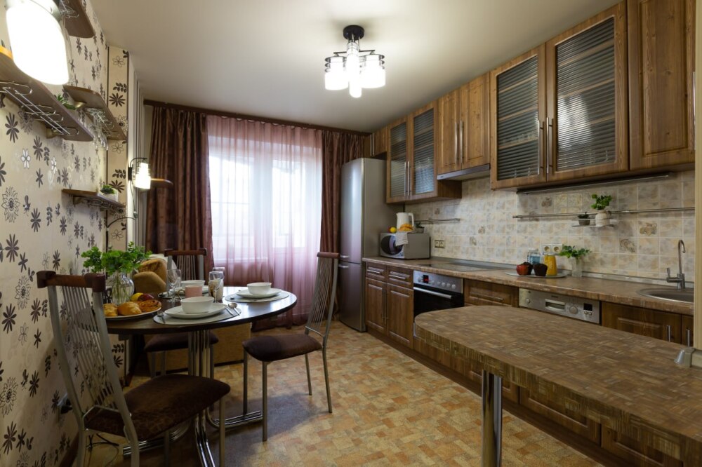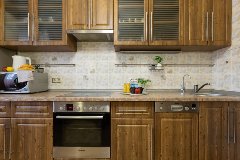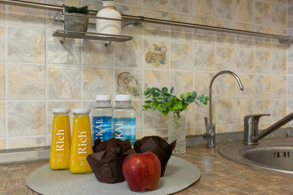 Кухня: плита, микроволновка, духовка, вытяжка, посудомоечная машина, чайник, холодильник, мини-бар, набор посуды и все необходимые принадлежности для приготовления пищи, чай/кофе, соль, сахар, растительное масло, специи, минеральная вода.