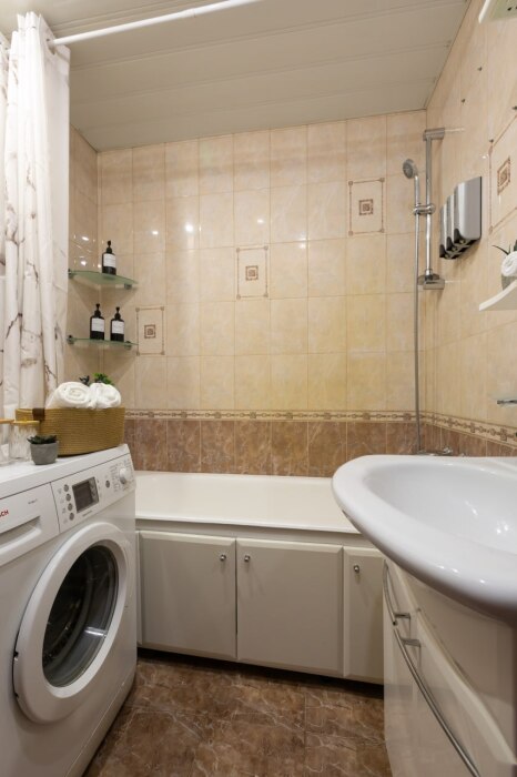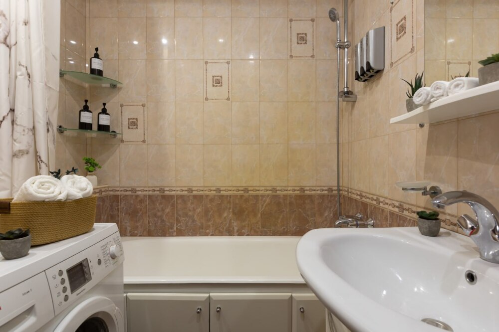 Ванная комната: ванна, стиральная машина, фен, стиральный порошок, средства для мытья посуды, средства гигиены: шампунь, гель для душа, бальзам, жидкое мыло в дозаторах, косметический набор, мицеллярная вода, ватные диски, ватные палочки, крем для рук, зубной набор, одноразовые тапочки.