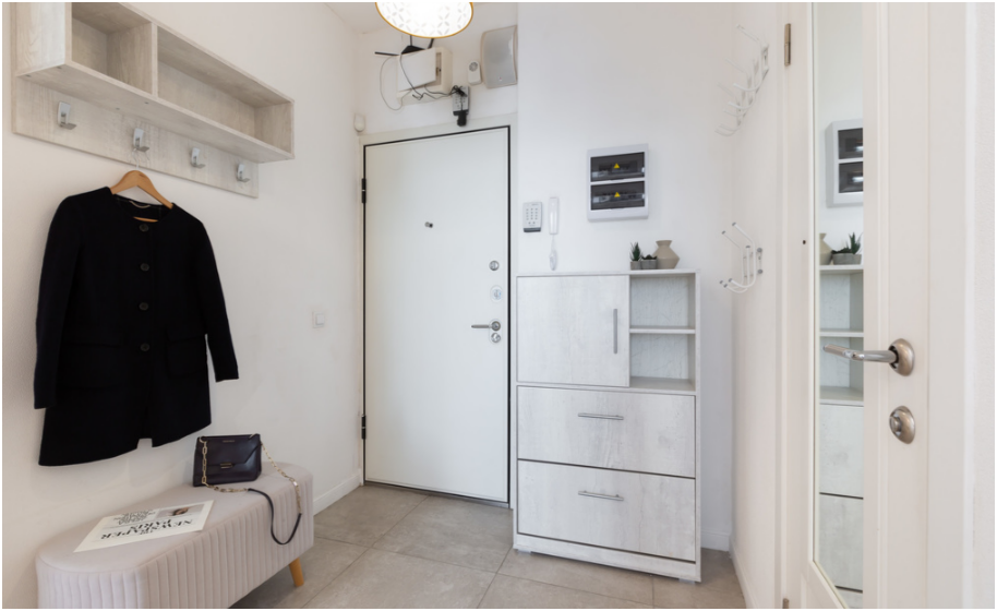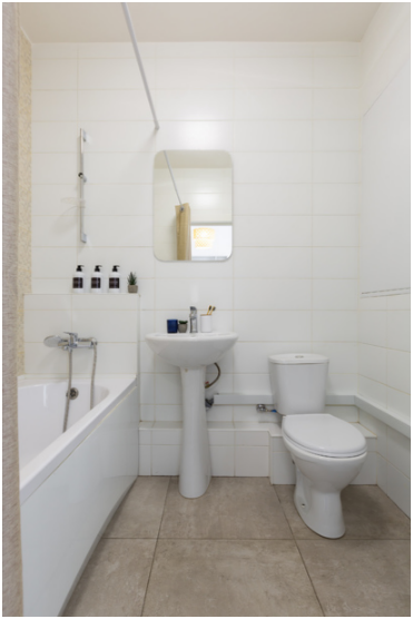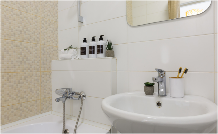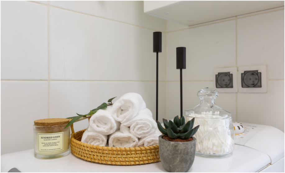 Ванная комната: ванна, стиральная машина, фен, стиральный порошок, средства для мытья посуды, средства гигиены: шампунь, гель для душа, бальзам, жидкое мыло в дозаторах, косметический набор, мицеллярная вода, ватные диски, ватные палочки, крем для рук, зубной набор, одноразовые тапочки.