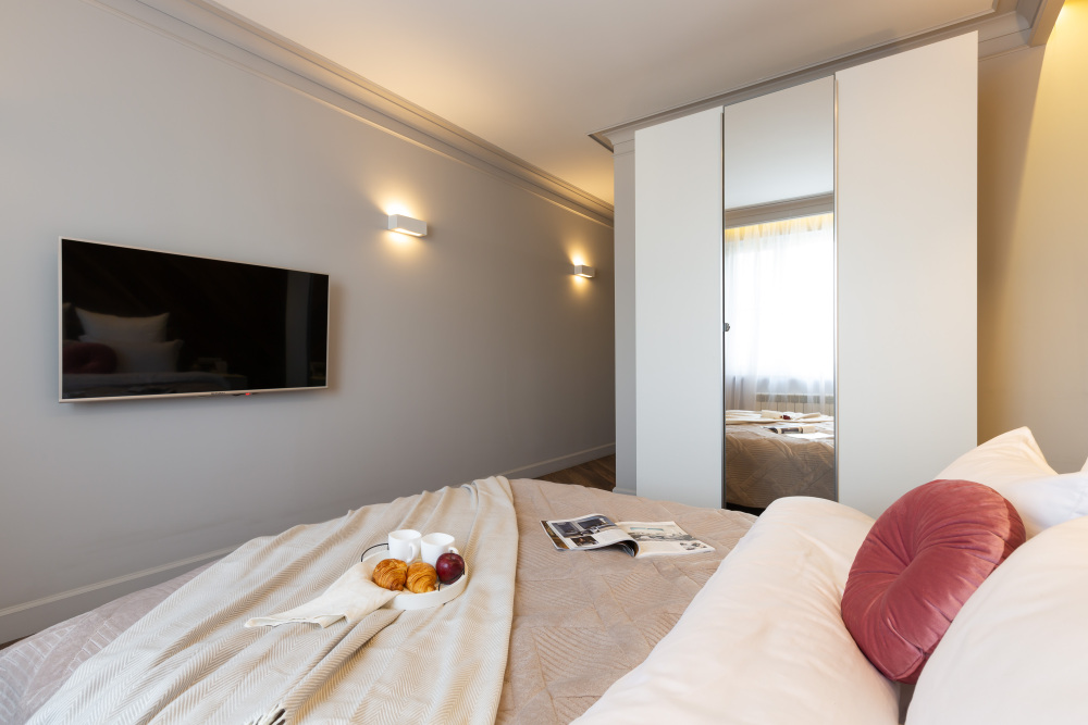 В квартире есть все необходимое для проживания 4-х человек: широкая двуспальная кровать с ортопедический матрасом и независимыми пружинами (160х200), двуспальный диван-кровать (180х200), плотные шторы портьеры блекаут для Вашего комфортного сна, вместительный шкаф для одежды, Wi-Fi, Smart TV/кабельное TV, гладильная доска, утюг, сушилка, свежее качественное постельное белье, комплект мягких полотенец.
