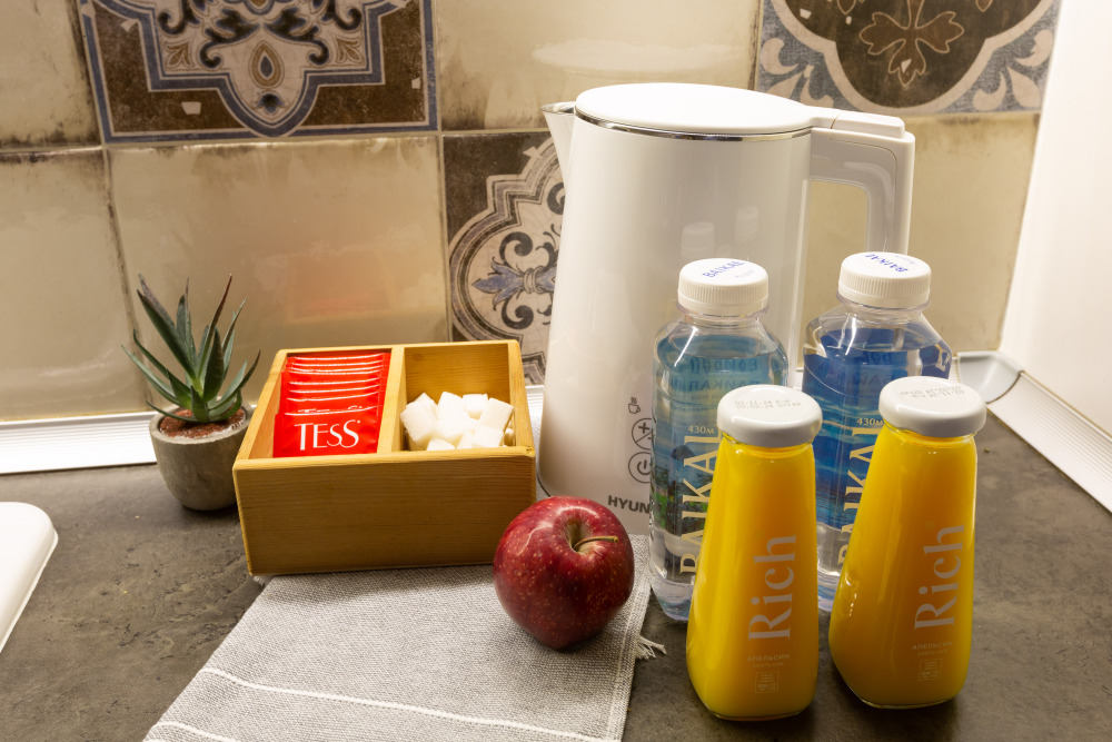 Кухня: плита, микроволновка, духовка, вытяжка, чайник, холодильник, мини-бар, набор посуды и все необходимые принадлежности для приготовления пищи, чай/кофе, соль, сахар, растительное масло, специи, минеральная вода.