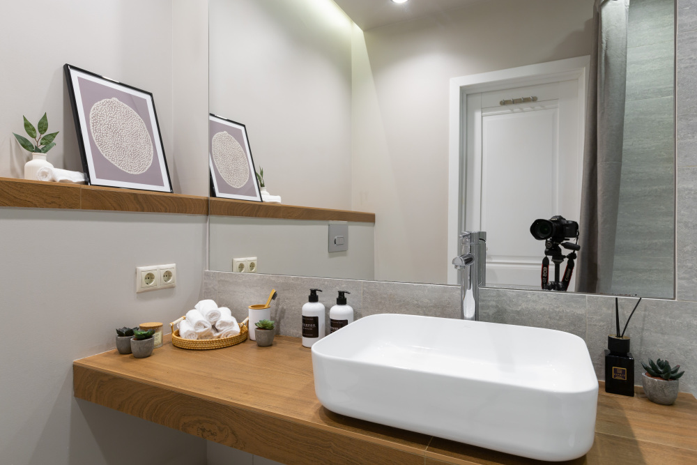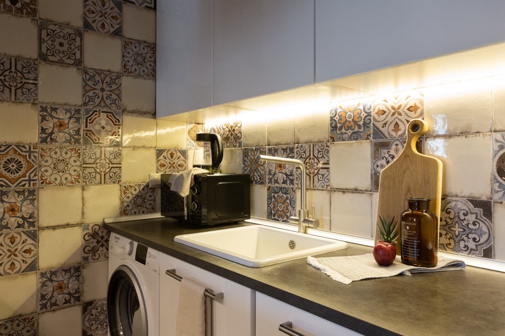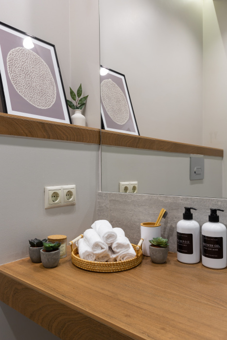 Ванная комната: ванна, стиральная машина, фен, стиральный порошок, средства для мытья посуды, средства гигиены: шампунь, гель для душа, бальзам, жидкое мыло в дозаторах, косметический набор, мицеллярная вода, ватные диски, ватные палочки, крем для рук, зубной набор, одноразовые тапочки.