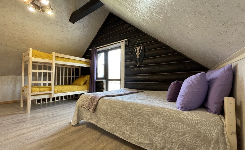 На втором этаже: 2 спальни (6 основных спальных мест: 2 двуспальные кровати, 1 двухъярусная. Доп.место (комплект белья на кресло-кровать).