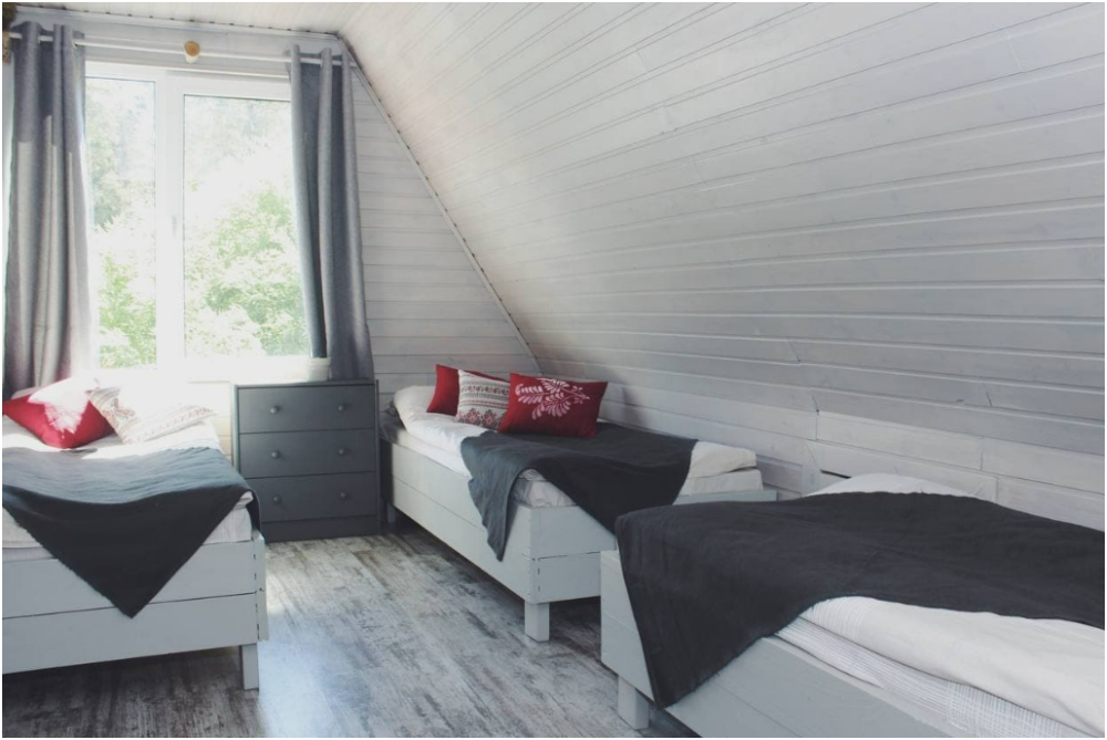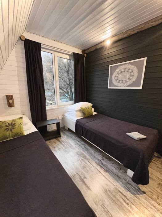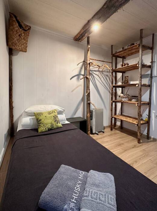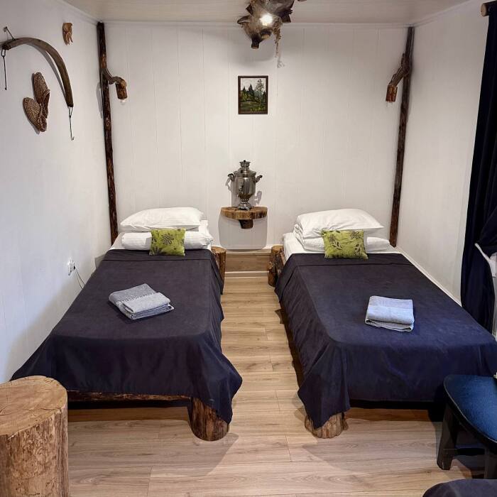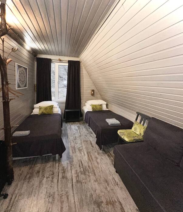 Двухместный номер на 2-м этаже с 2 отдельными односпальными кроватями. С видом на вольеры с ездовыми собаками.