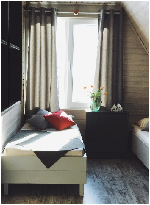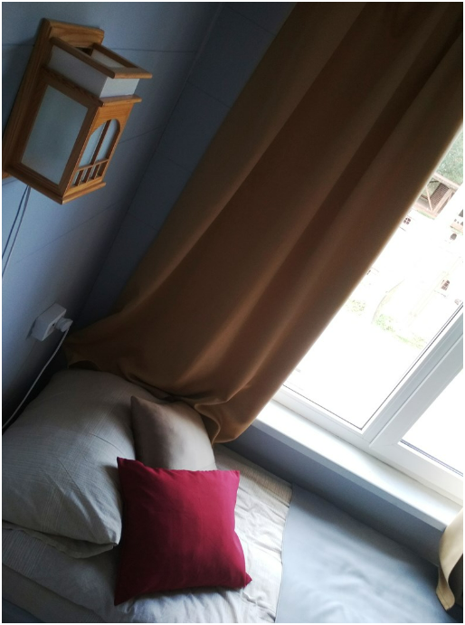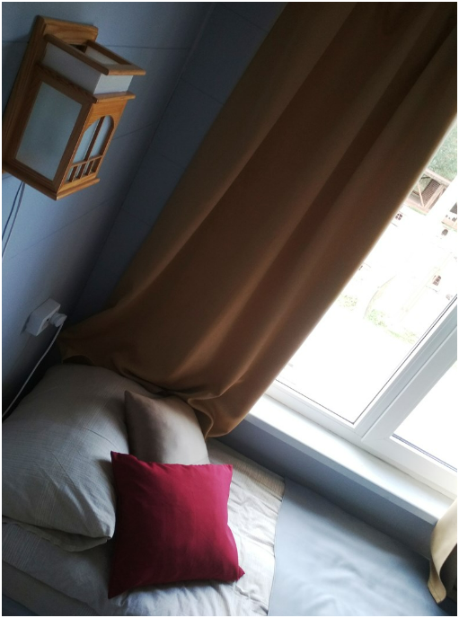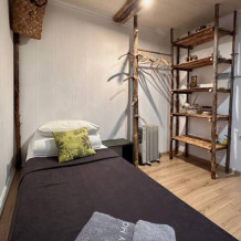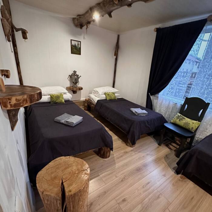 Светлый и уютный трехместный номер на 1 этаже. Раздельные кровати и декор из натурального дерева. Вид из окна во внутренний дворик.
