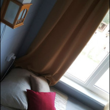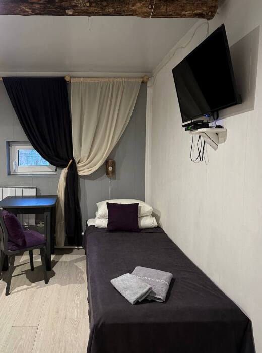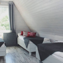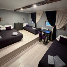 Просторный четырехместный номер на 1 этаже с одной двуспальной и двумя раздельными односпальными кроватями. В номере подключен телевизор.