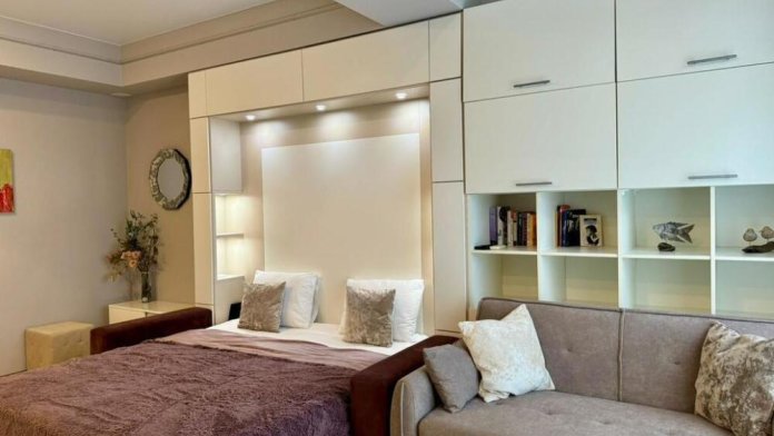 - квартире могут разместиться 3 гостя: двуспальная кровать-трансформер + удобный односпальный диван.