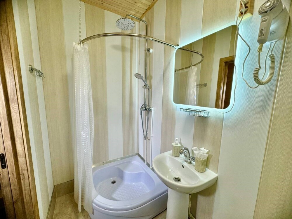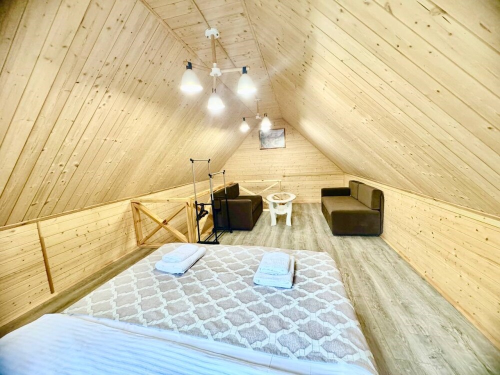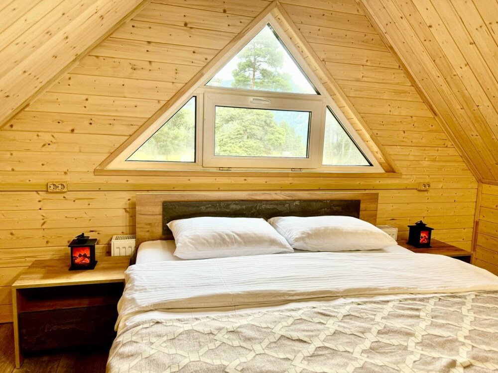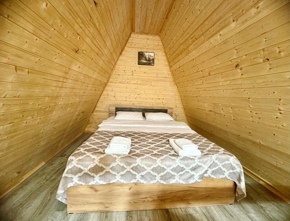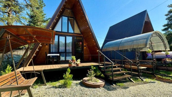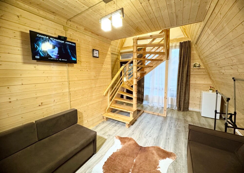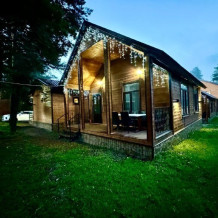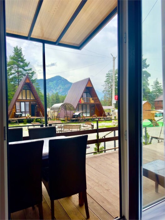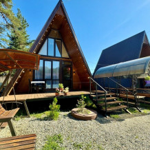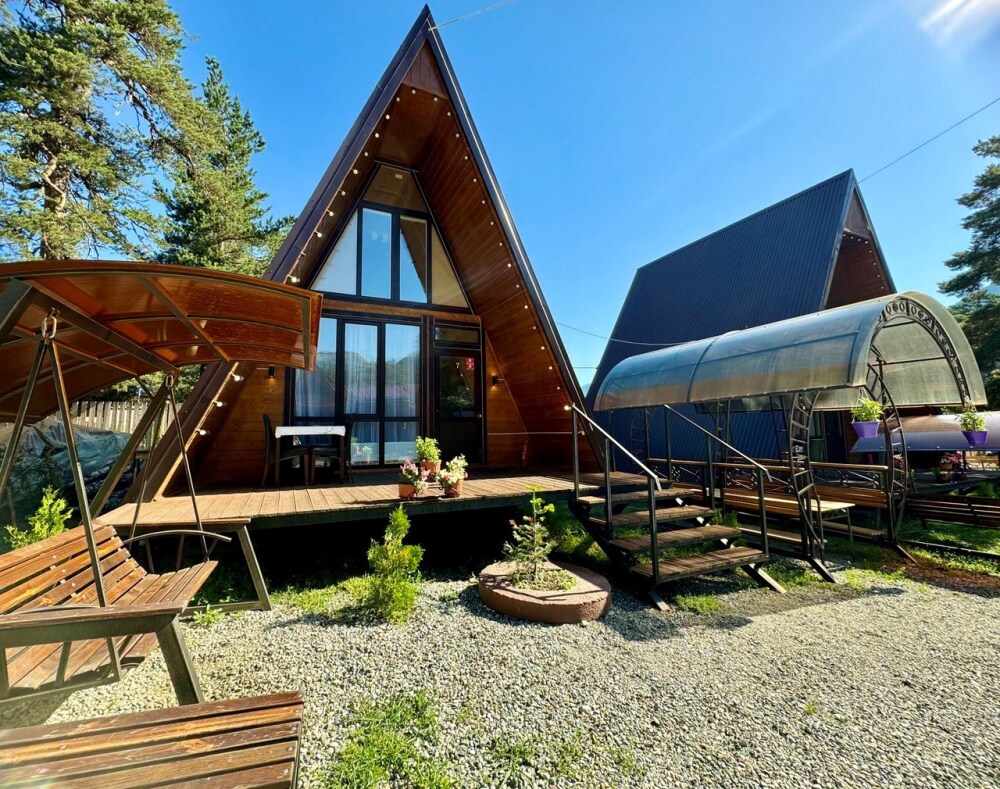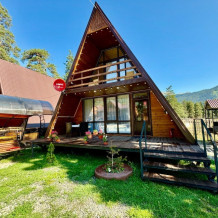 На благоустроенной территории находится комплекс из 9 разных по стилю и площади эко-домов и 4 номера категории «Стандарт» с зонами отдыха на террасах. Вам предлагают уютные современные домики: треугольные А-фреймы, многокомнатные шале, 2-этажные бунгало c 3-мя спальнями, 3-этажный дом «Премиум» с камином.