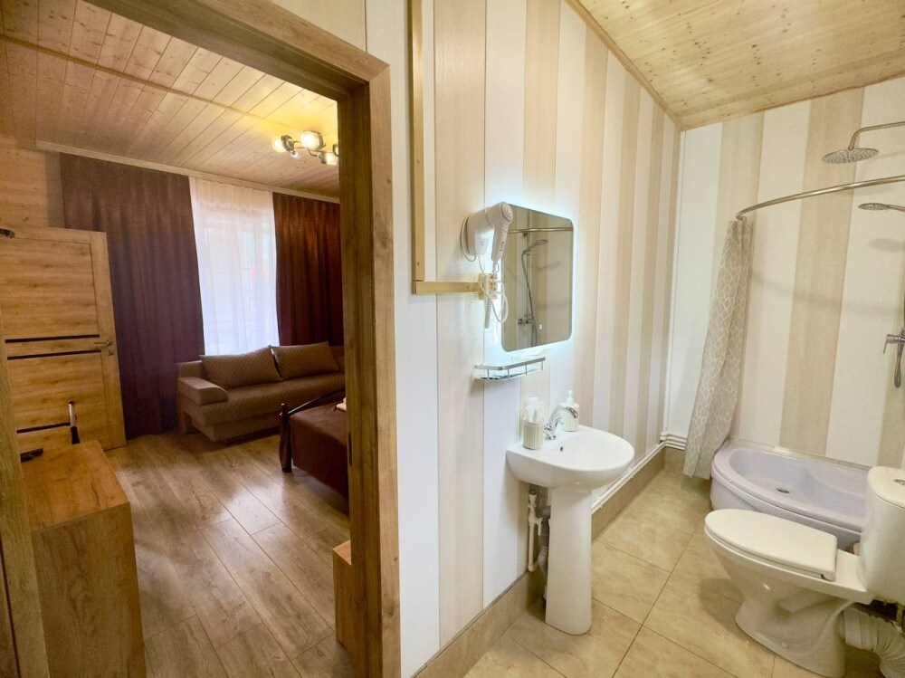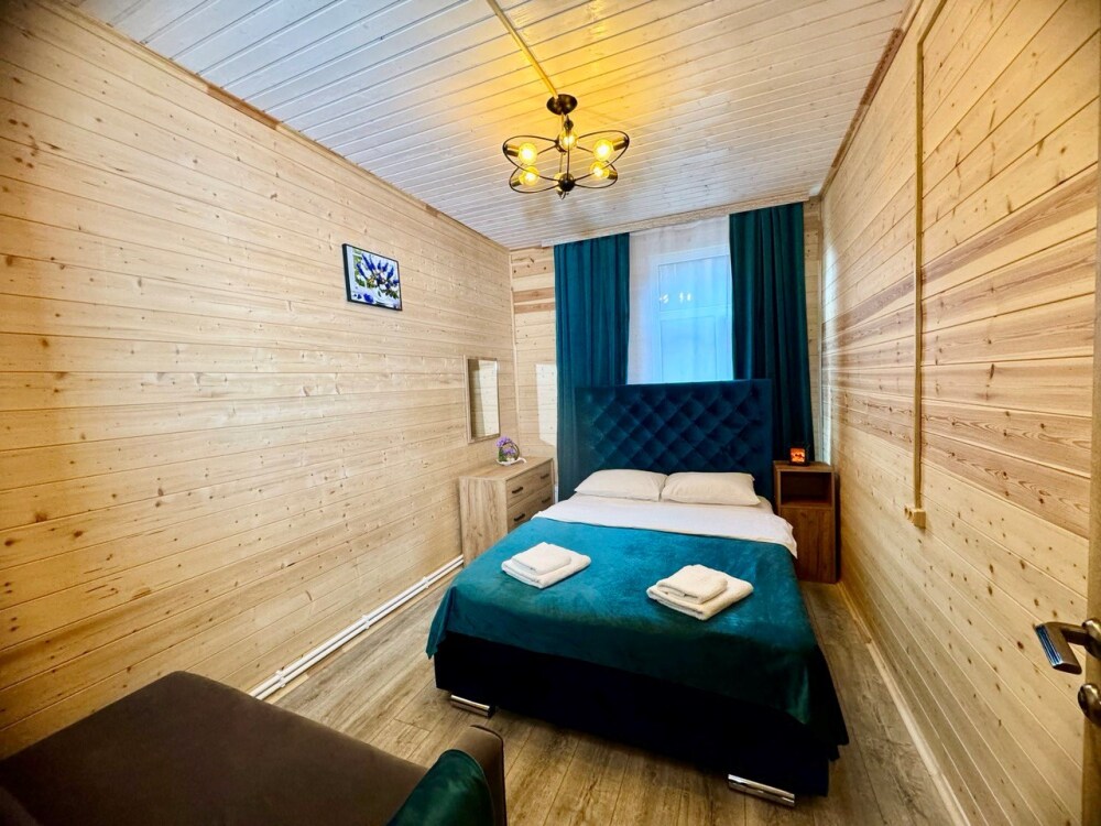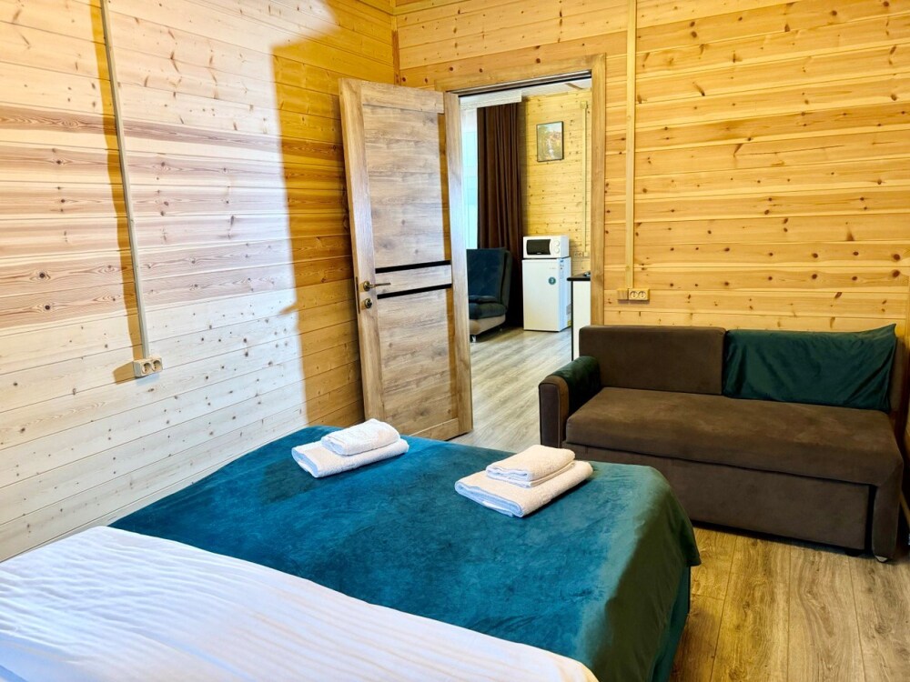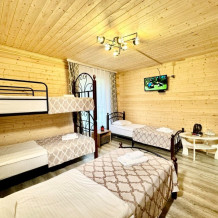 Оснащение номера: Smart-ТV (спутниковое), микроволновая печь, электрическая печь, электрический чайник, мини-холодильник с морозильной камерой, посуда, фен, а также тапочки, 3 полотенца на гостя.