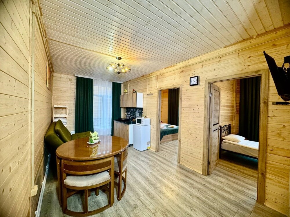Оснащение номера: Smart-ТV (спутниковое), электрическая плита, микроволновая печь, электрический чайник, холодильник с морозильной камерой, посуда (сковорода, кастрюля, тарелки, стаканы, бокалы, столовые приборы), фен, а также чай/кофе, тапочки, 3 полотенца на гостя.