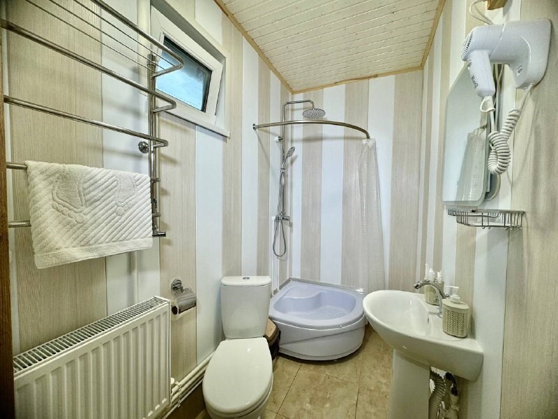 Оснащение номера: Smart-ТV (спутниковое), электрический чайник, чайные пары, фен, тапочки, 3 полотенца на гостя.