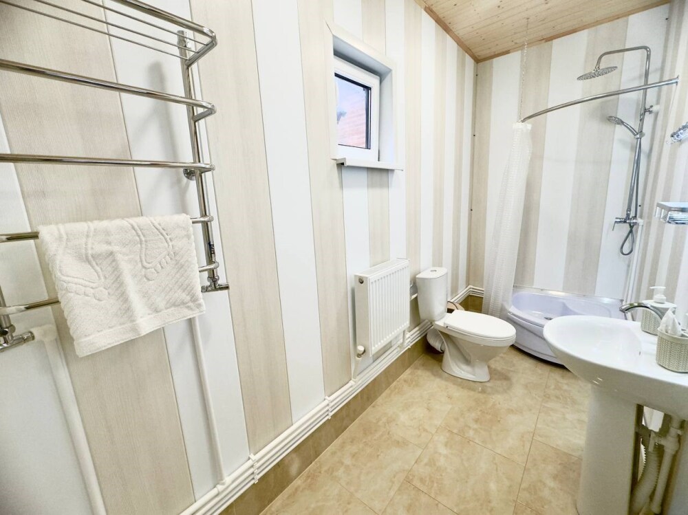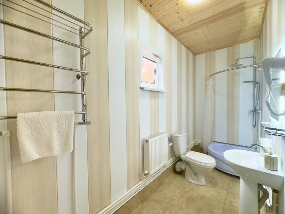 2 санузла: душ, раковина, туалет, базовые гигиенические средства: мыло, шампунь, гель для душа, зубной набор.