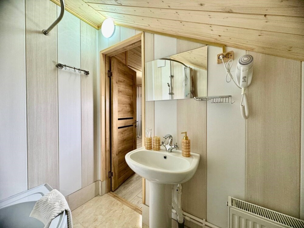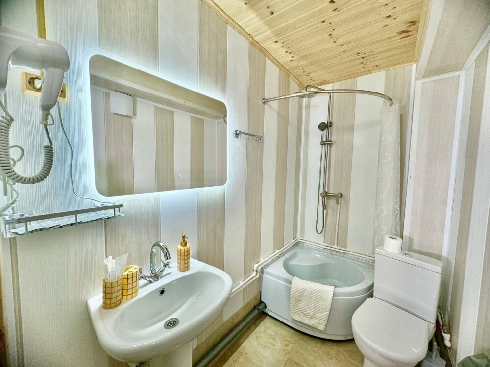 2 санузла: душ, раковина, туалет, базовые гигиенические средства (мыло, шампунь, гель для душа, зубной набор).