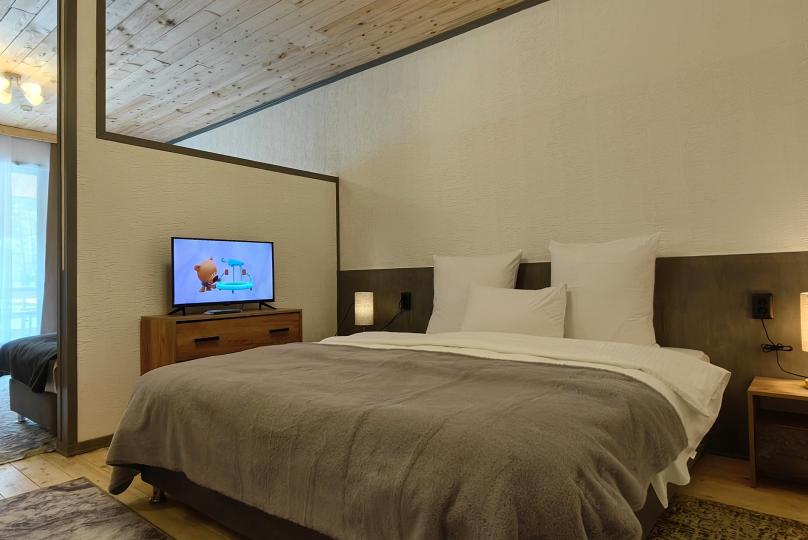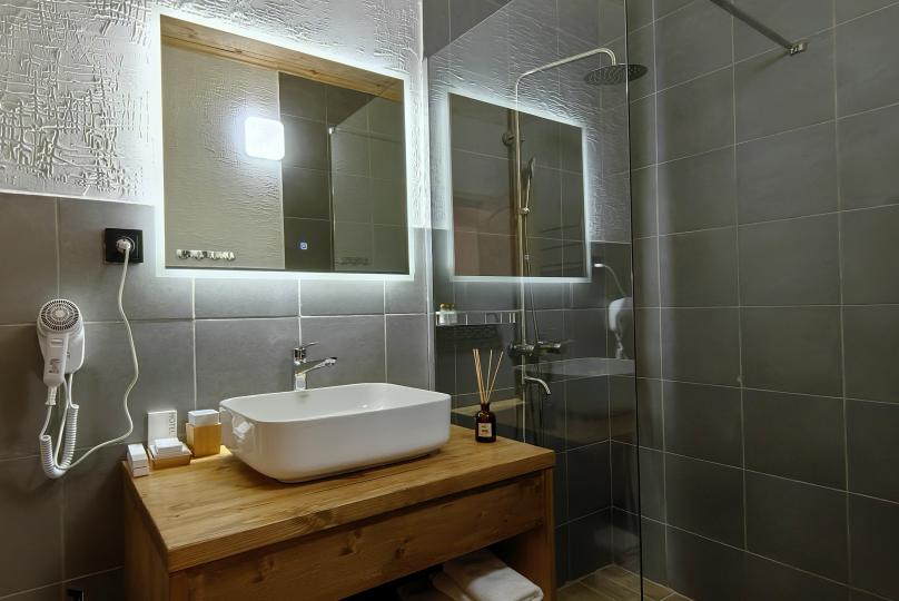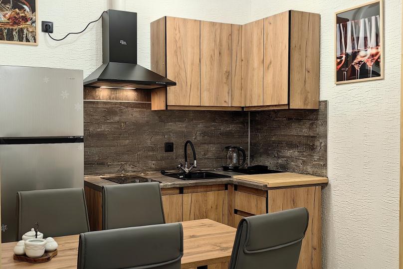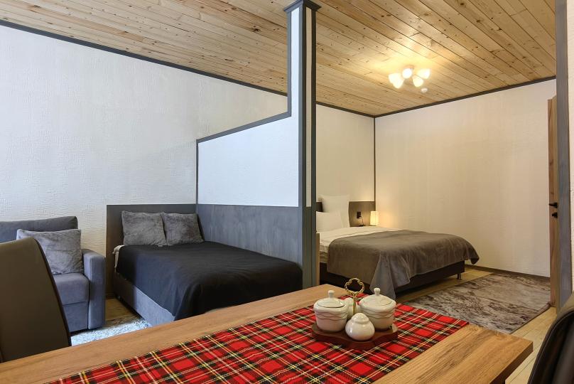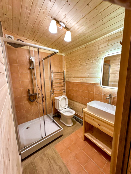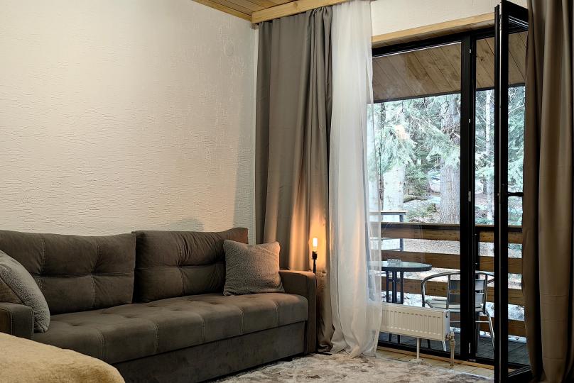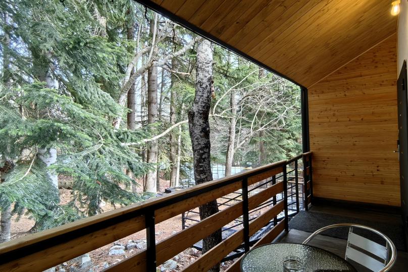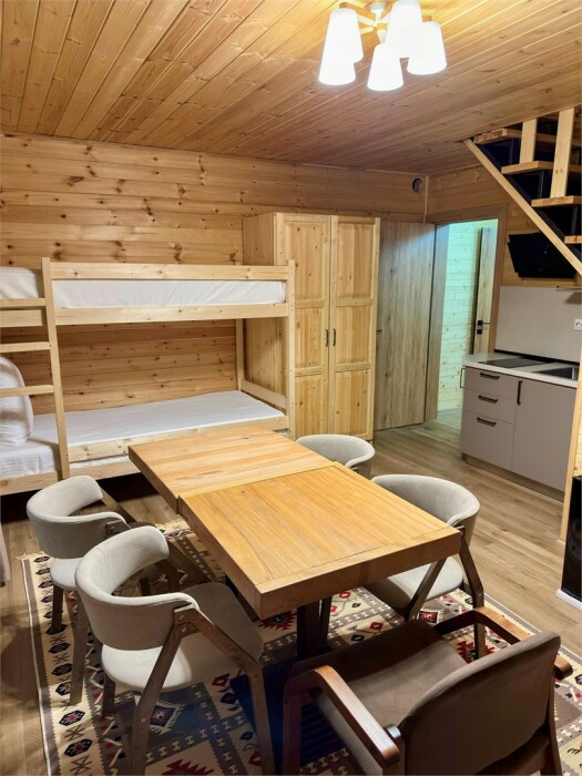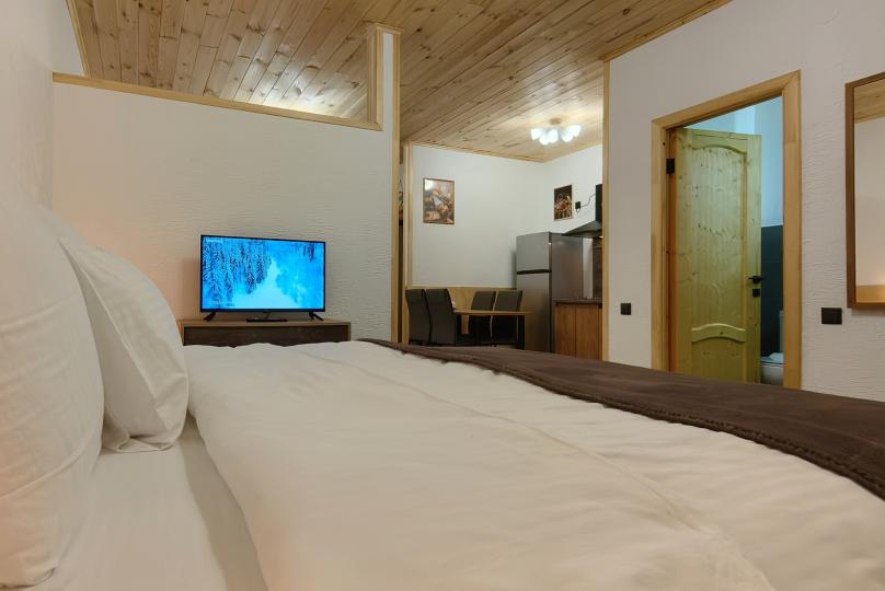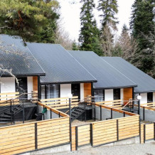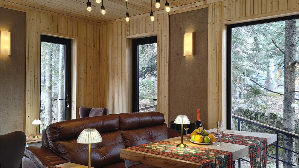 Домик с прекрасным видом на лес не оставит равнодушным даже самого изысканного любителя естественных природных пейзажей. Стоит заглянуть под завесу лесной пелены, и перед глазами открываются сказочные просторы, необыкновенно завораживающие картины живого леса. Домик рассчитан на проживание максимум 4 гостей: двуспальная кровать, односпальная кровать, а так же диван. Кухня в полностью оборудована для приготовления пищи, включая индукционную плиту, посуду, холодильник и микроволновую печь. В коттеджах также есть ванная комната, балкон, веранда.