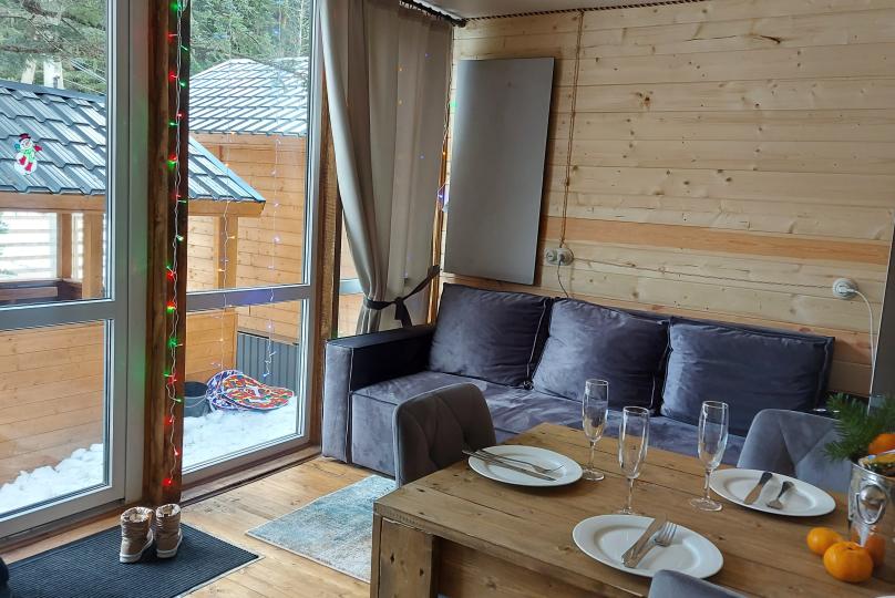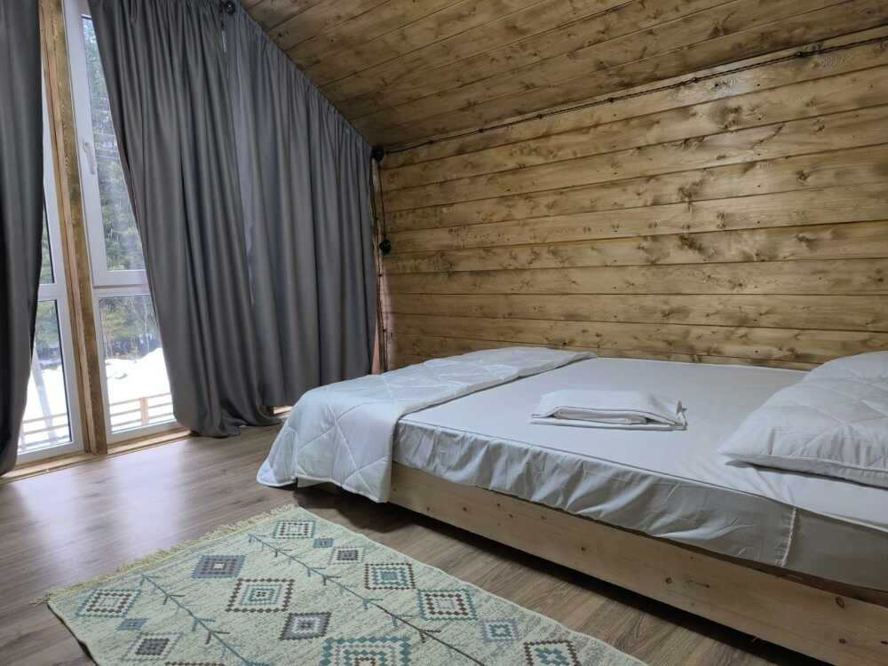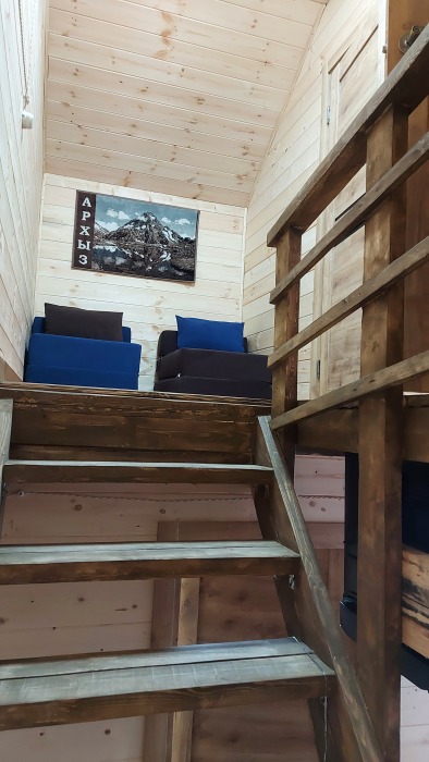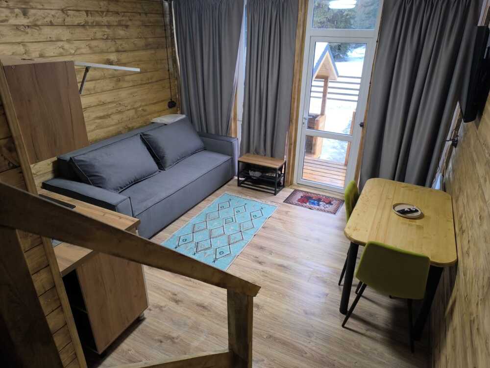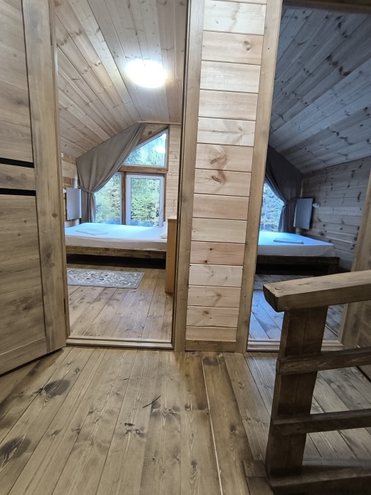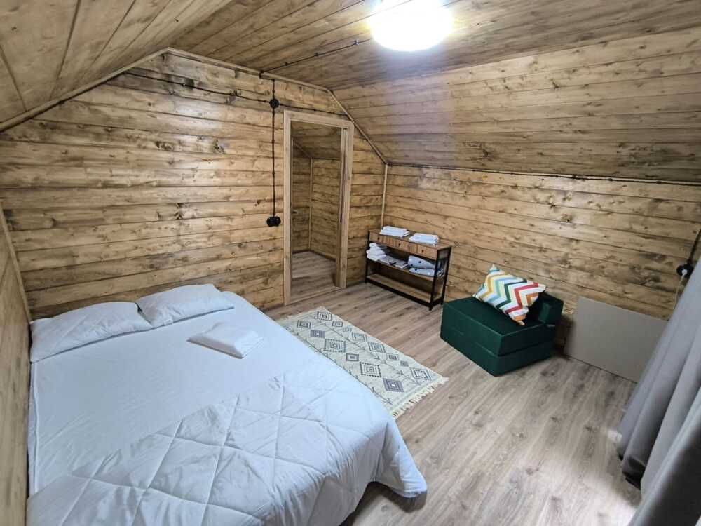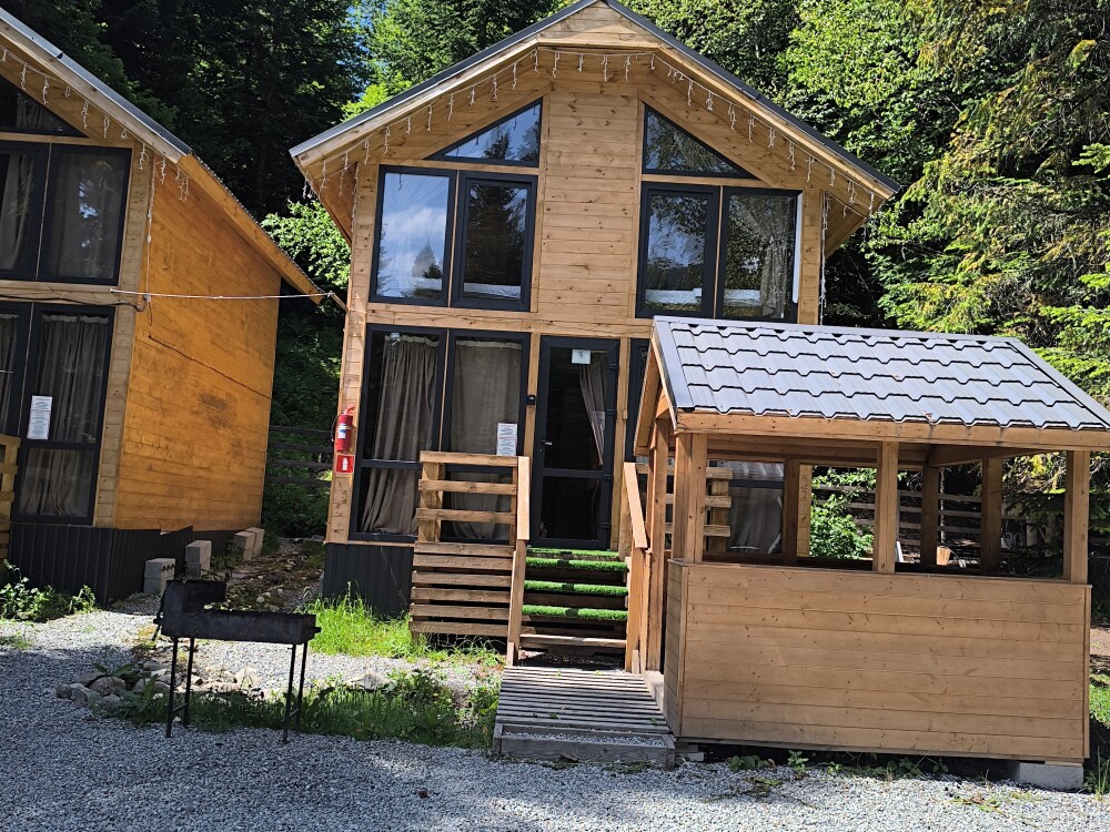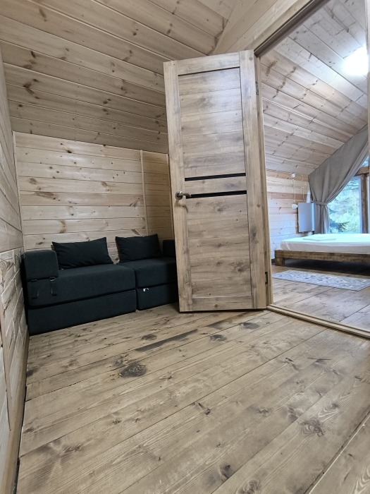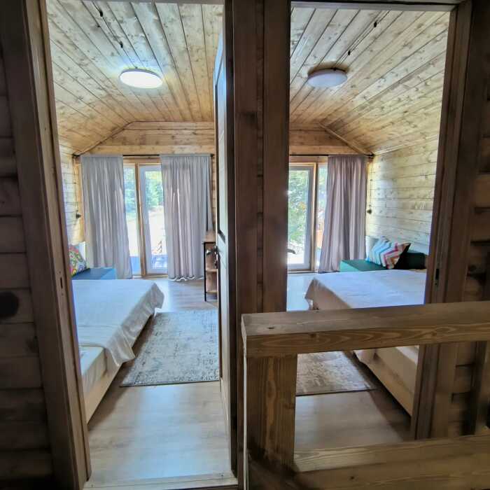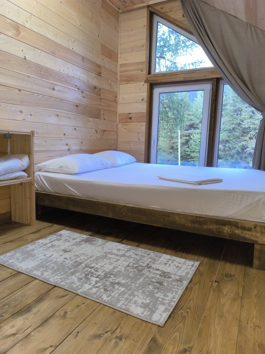 На базе отдыха два 2-этажных барнхауса, на втором этаже 2 спальни изолированные с дверьми и 2 кресла раскладные. На 1 этаже - студия с диванами раскладными, кухня и ванная комната. Дом с видом на горы и хвойный лес. Также 2 дома 2-местных, со всеми удобствами, в домах спальня и гостиная с диваном раскладным плюс кухонная зона, ванная комната и веранда.