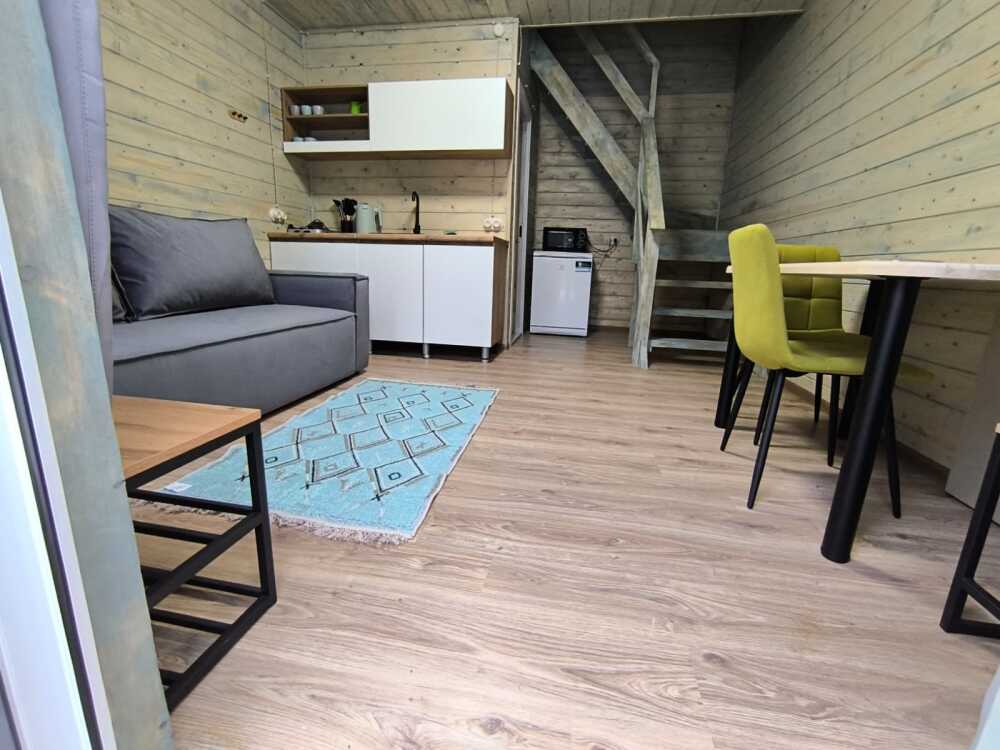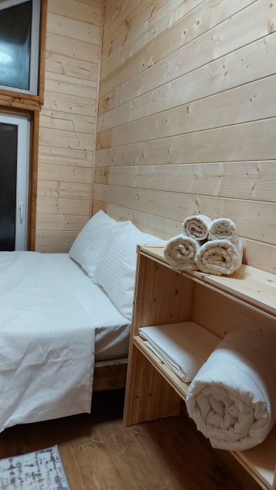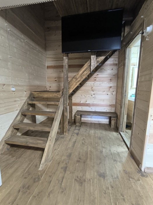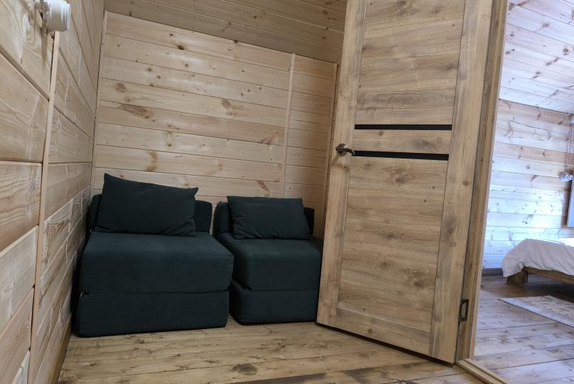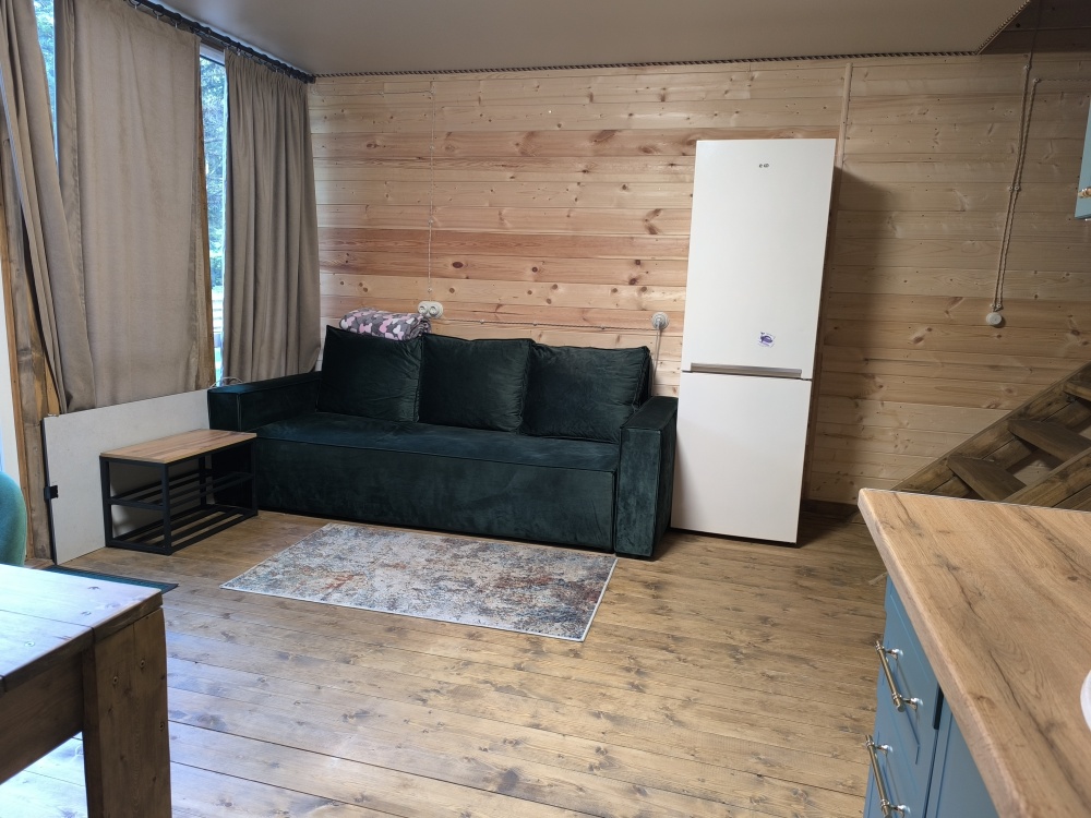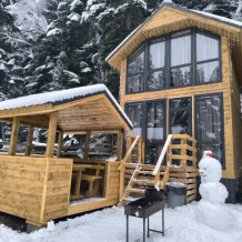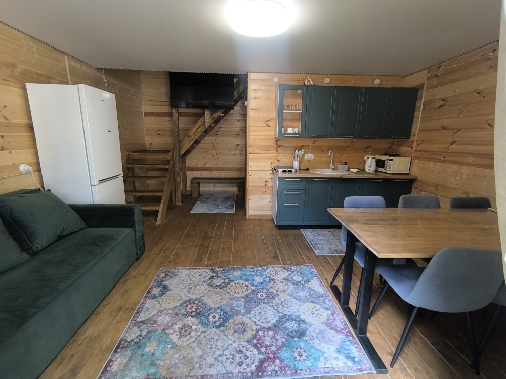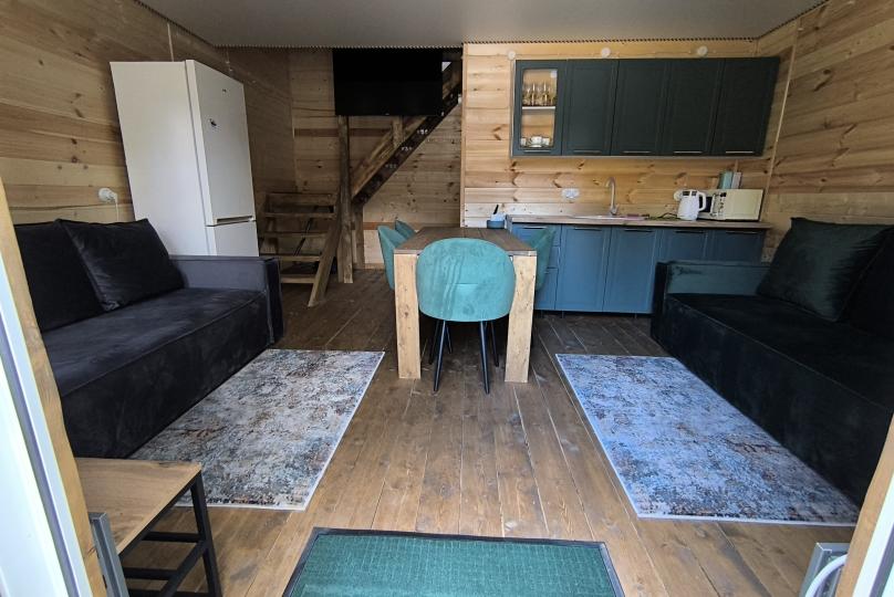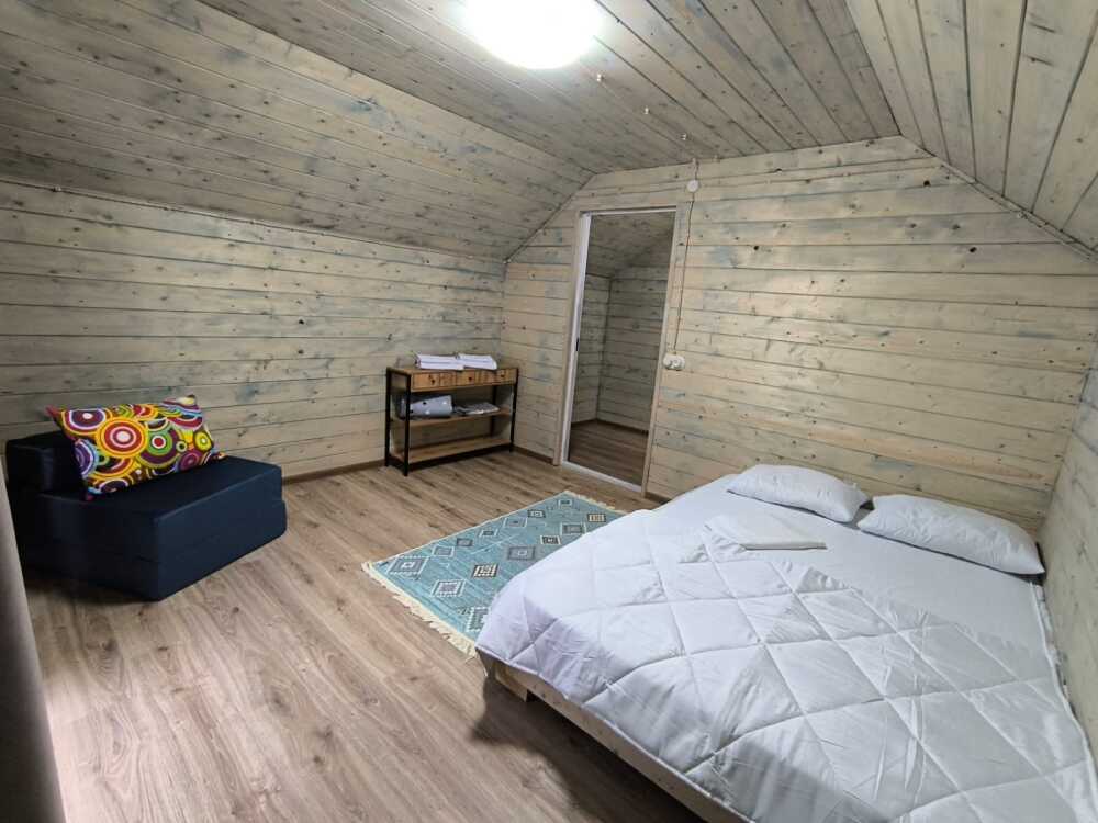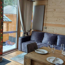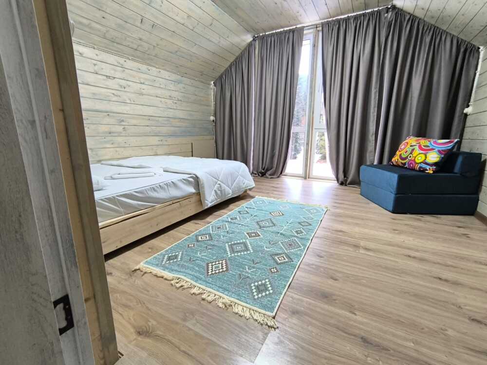 На базе отдыха два 2-этажных барнхауса, на втором этаже 2 спальни изолированные с дверьми и 2 кресла раскладные. На 1 этаже - студия с диванами раскладными, кухня и ванная комната. Дом с видом на горы и хвойный лес. Также 2 дома 2-местных, со всеми удобствами, в домах спальня и гостиная с диваном раскладным плюс кухонная зона, ванная комната и веранда.