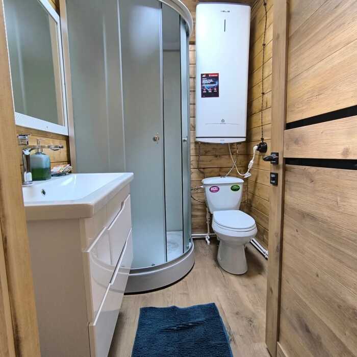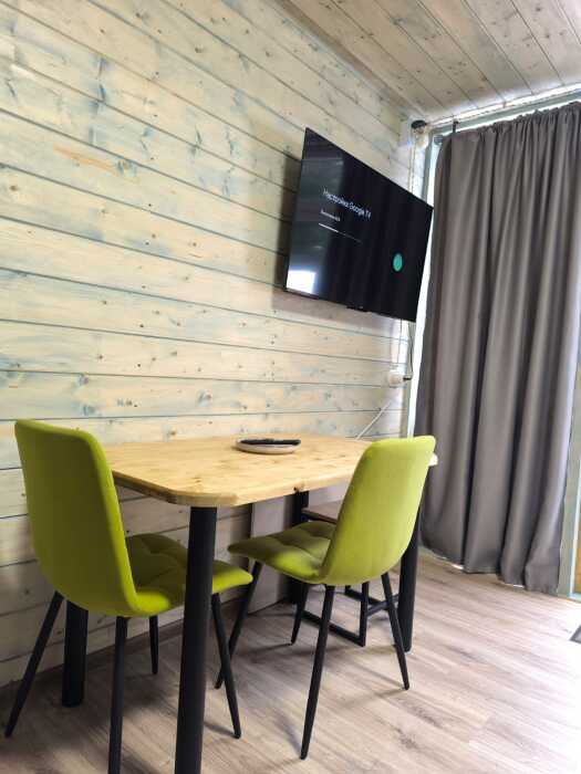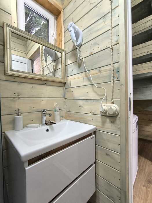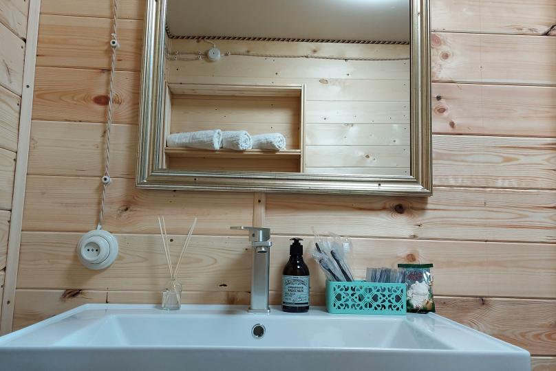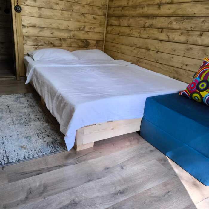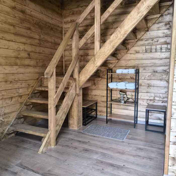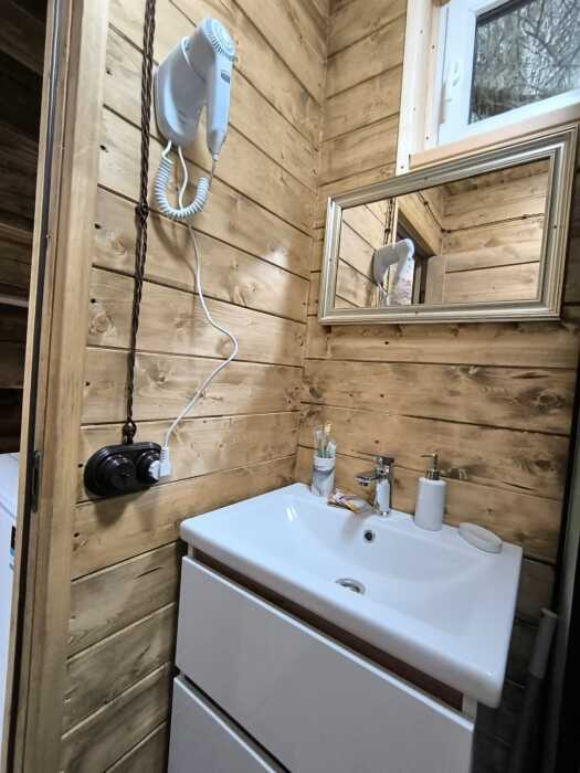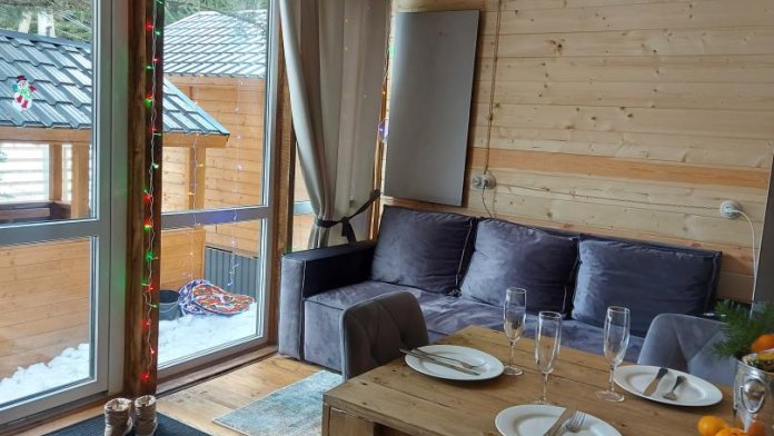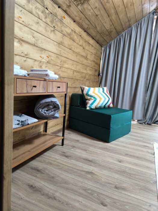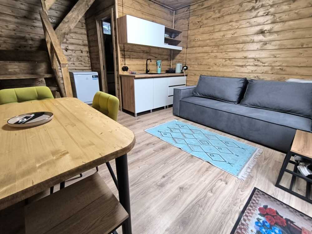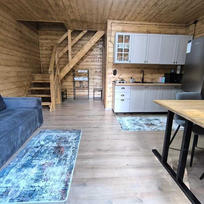 На базе отдыха два 2-этажных барнхауса, на втором этаже 2 спальни изолированные с дверьми и 2 кресла раскладные. На 1 этаже - студия с диванами раскладными, кухня и ванная комната. Дом с видом на горы и хвойный лес. Также 2 дома 2-местных, со всеми удобствами, в домах спальня и гостиная с диваном раскладным плюс кухонная зона, ванная комната и веранда.