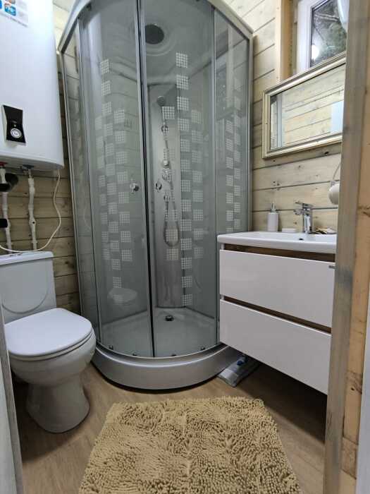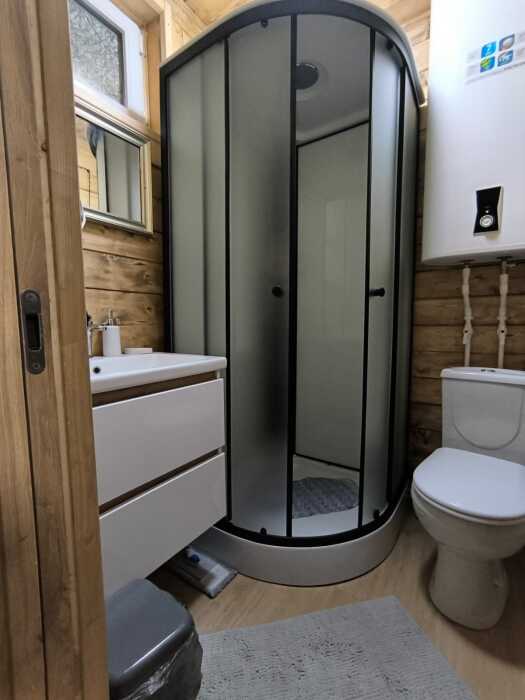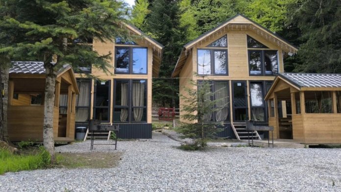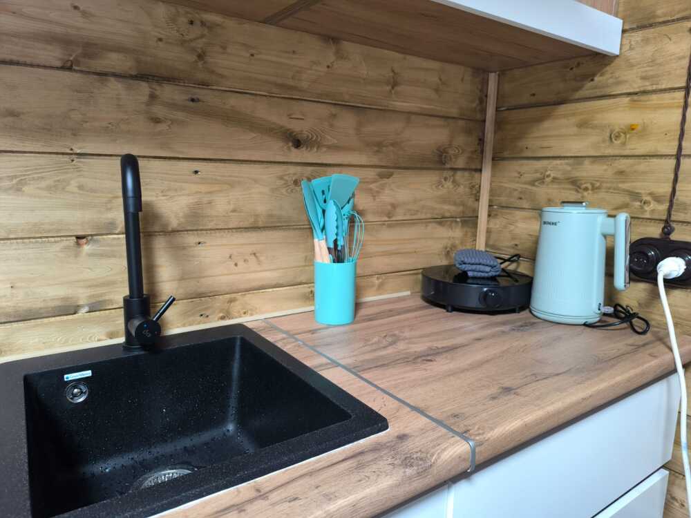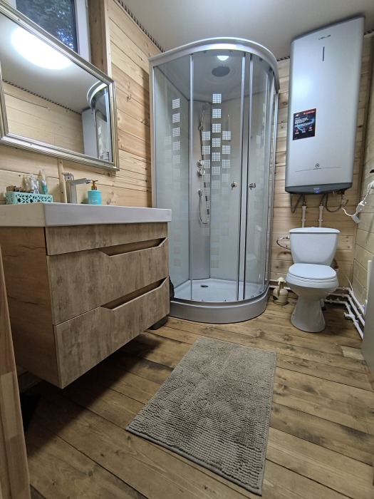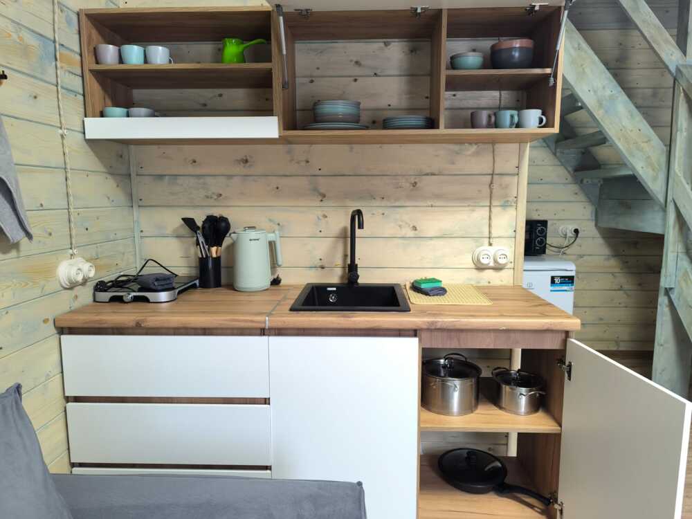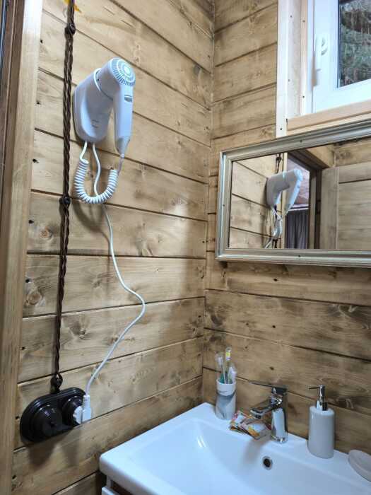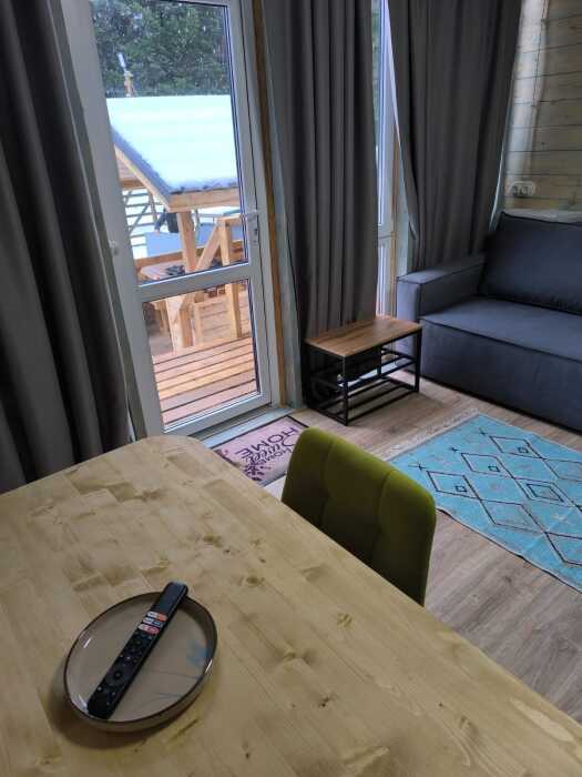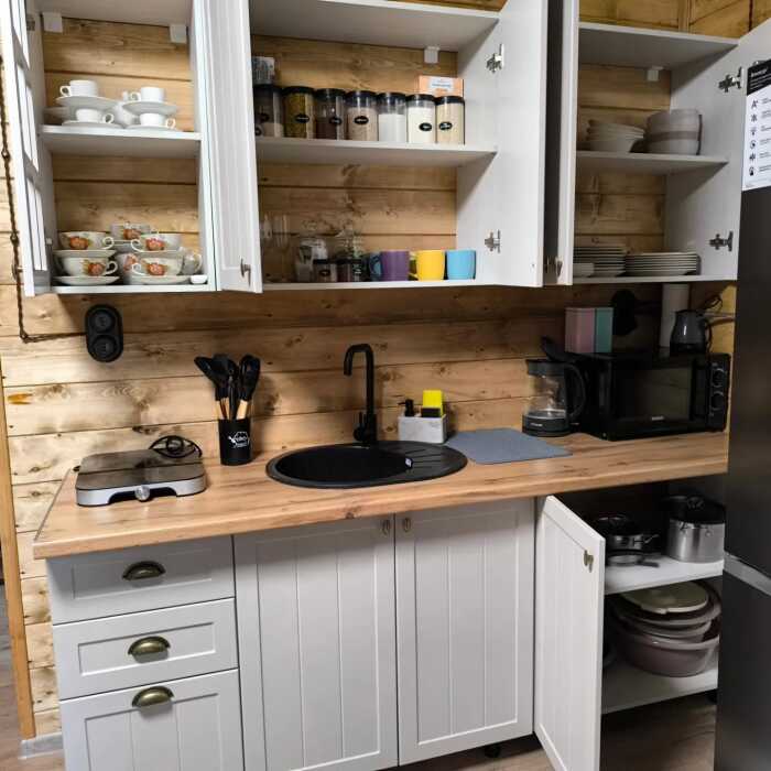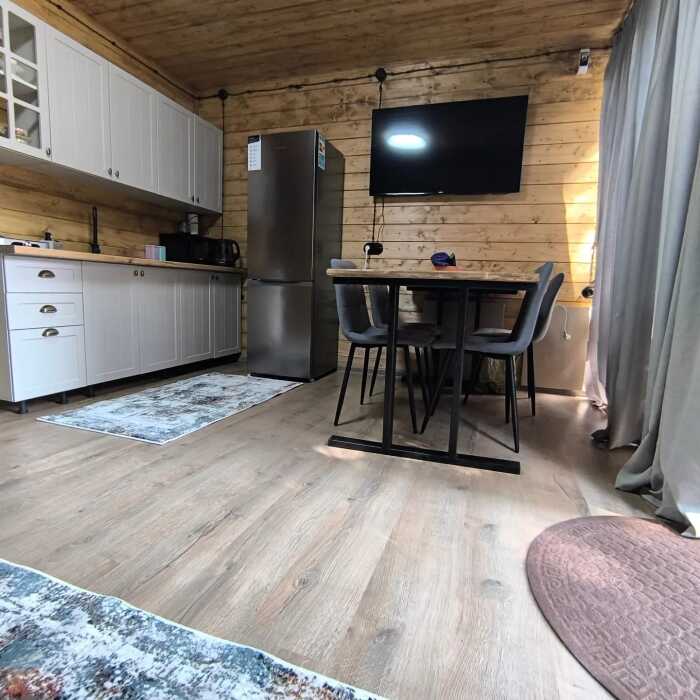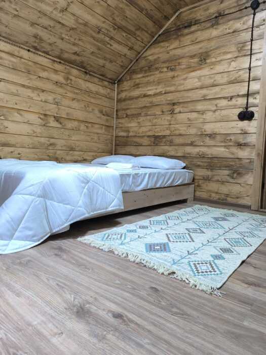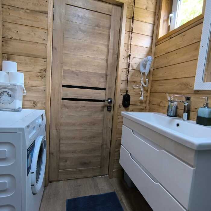 На базе отдыха два 2-этажных барнхауса, на втором этаже 2 спальни изолированные с дверьми и 2 кресла раскладные. На 1 этаже - студия с диванами раскладными, кухня и ванная комната. Дом с видом на горы и хвойный лес. Также 2 дома 2-местных, со всеми удобствами, в домах спальня и гостиная с диваном раскладным плюс кухонная зона, ванная комната и веранда.