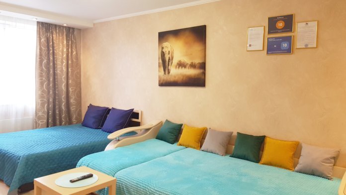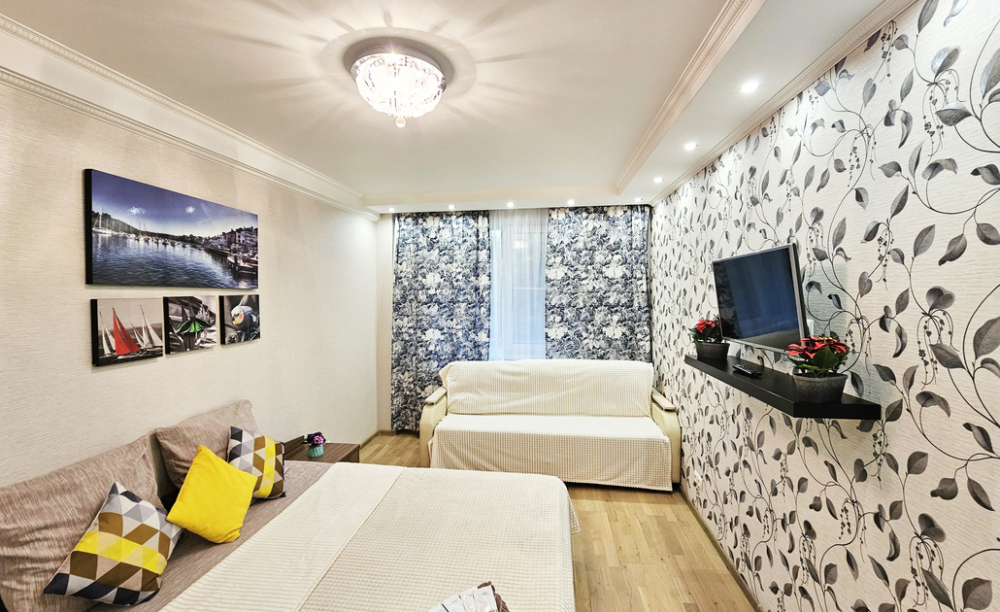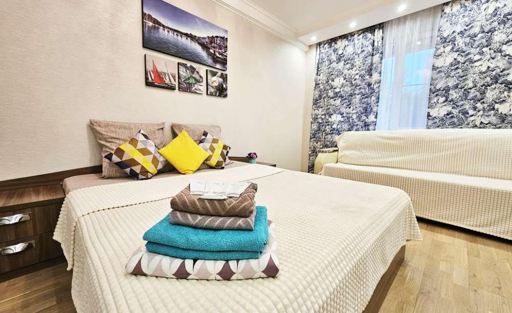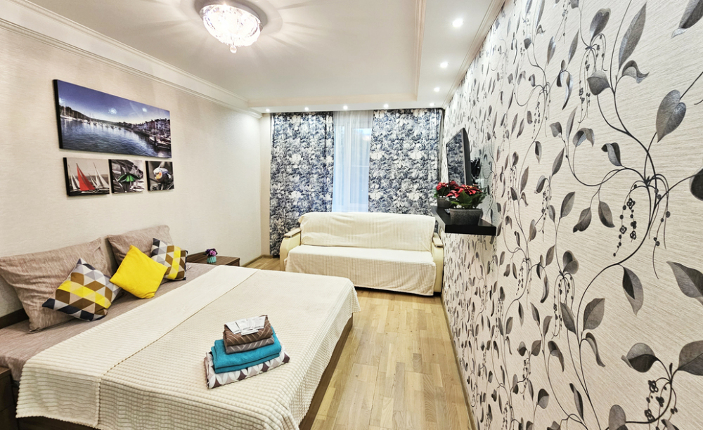 Вас ждет комфортное размещение в современной 3-комнатной студии: 2 кровати размера king size + 3 дивана. В этой квартире Вы сможете спокойно и комфортно поработать или просто отдохнуть после прогулок по городу и посещения Аквапарка и Зоопарка. Тихие спокойные соседи, ремонт никто не делает. У Вас под рукой будет все бесплатно: Wi-Fi, чай, кофе, шоколад, конфеты, индивидуальные средства гигиены, чистый комплект постельного белья и полотенец, 2 телевизора (для взрослых и детей), вся необходимая бытовая техника. Для наших любимых клиентов мы предусмотрели бесплатную (при наличии мест) охраняемую парковку на территории.