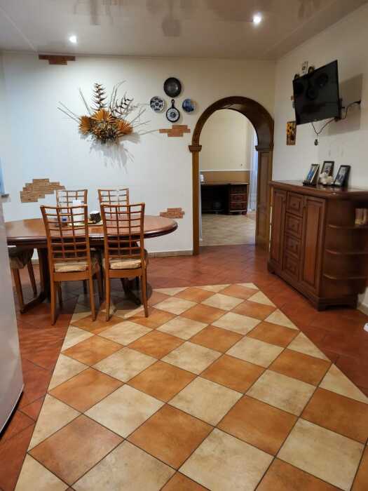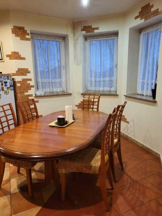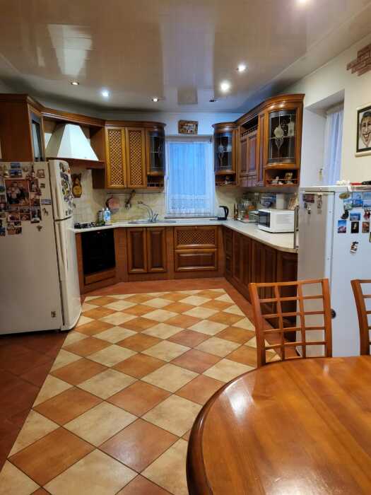 Дом предлагает воспользоваться полноценно обустроенной кухней, на которой есть разная техника: духовой шкаф, газовая плита, холодильник, а также чайник, посуда и обеденный стол.