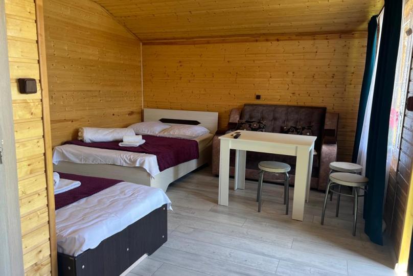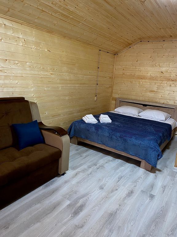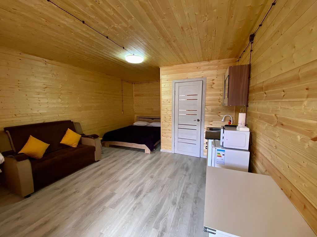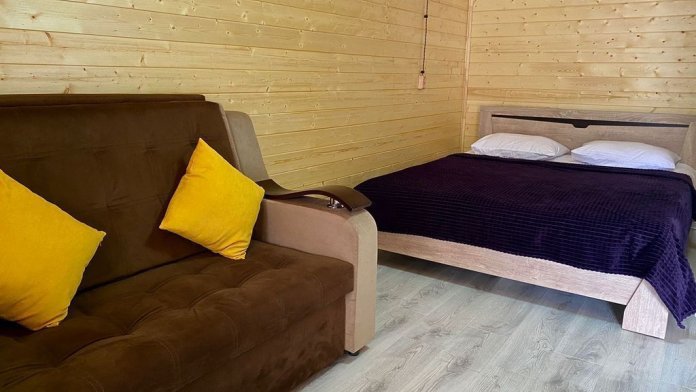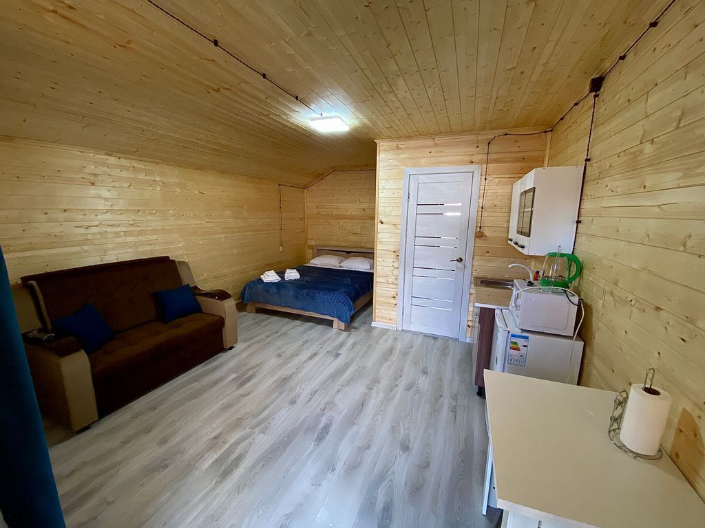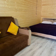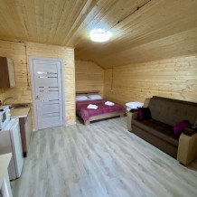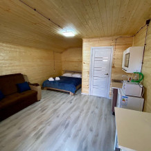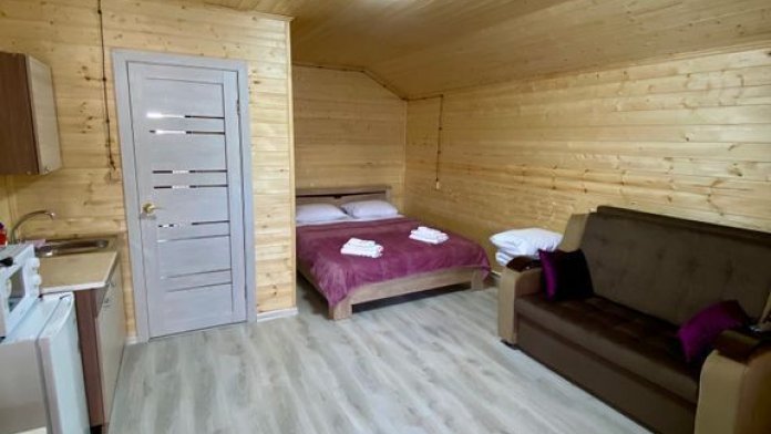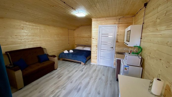 В номере есть все для комфортного проживания - кровать двушка, диван раскладной, кухонная зона с принадлежностями, холодильник, свч-печь, электрический чайник. Санузел в номере.