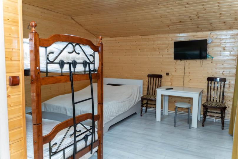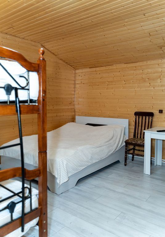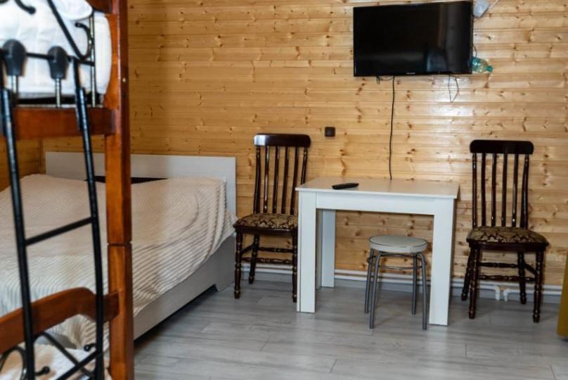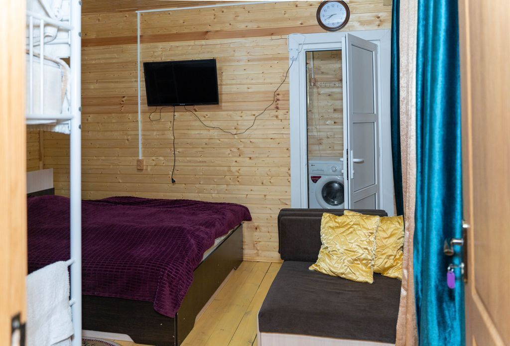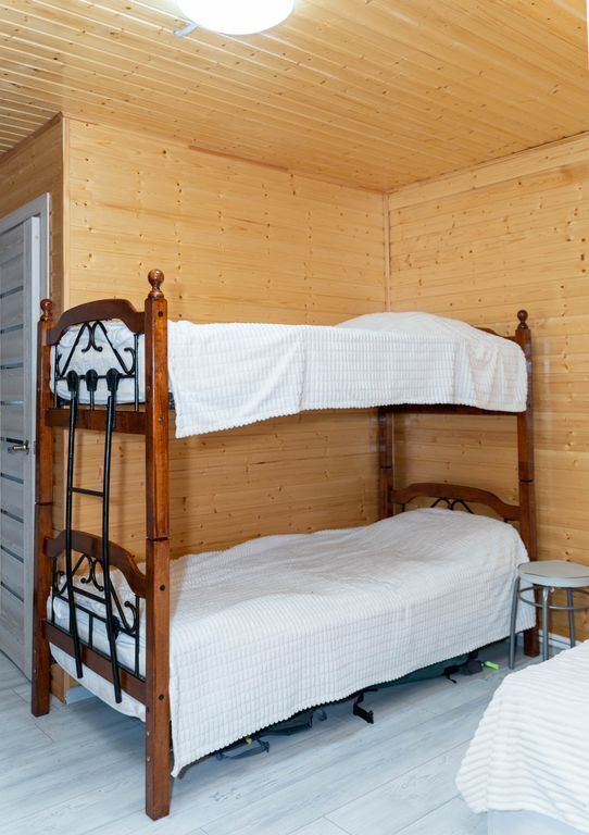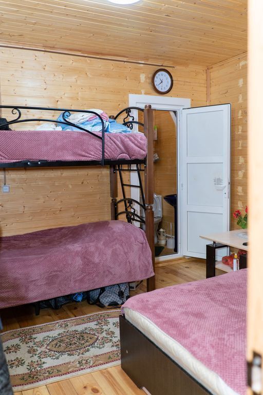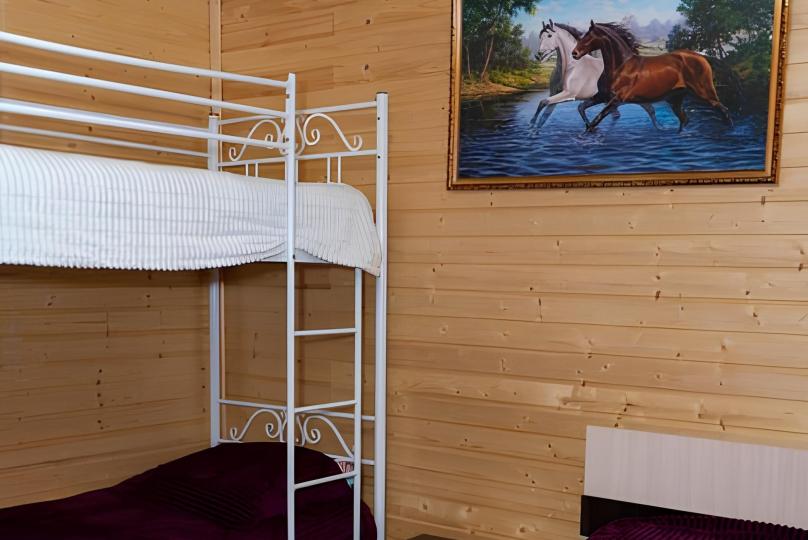 Два санузла и кухня. В комнате есть кровать двушка и ярусная кровать.