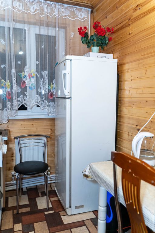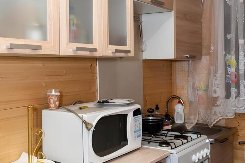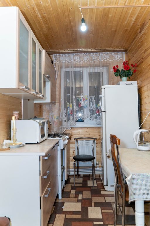 На кухне есть свч-печь, холодильник и вся утварь.