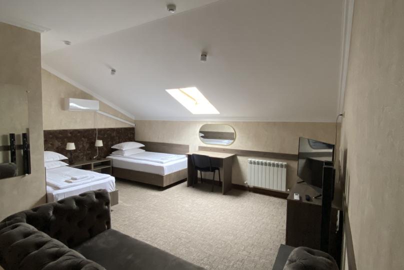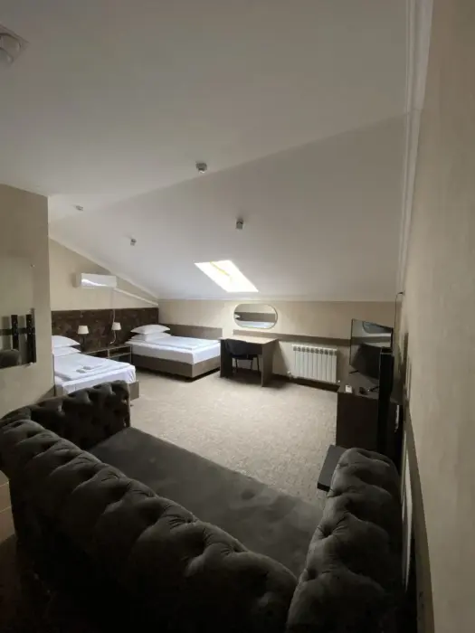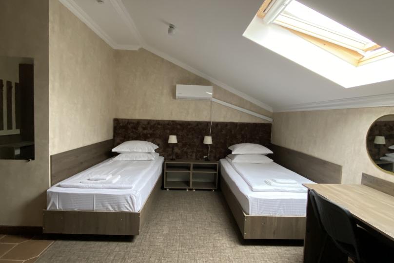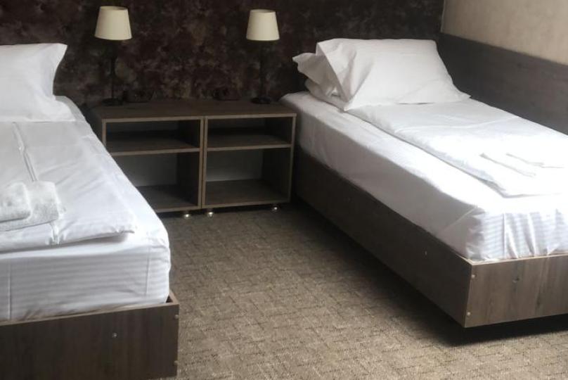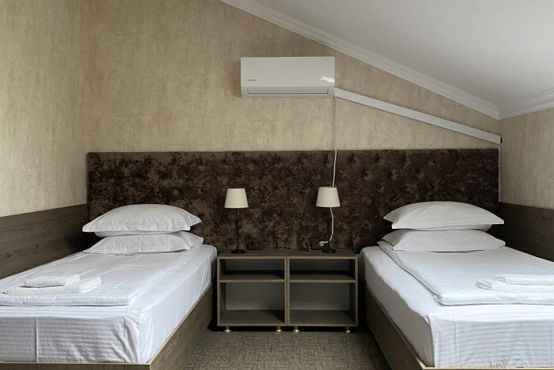 Номер с двумя раздельными кроватями со всеми удобствами площадью 30 квадратных метров. В номере есть ТВ зона с диваном, холодильник и фен, а так же вся необходимая мебель. Просторный санузел с ванной.