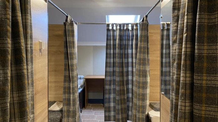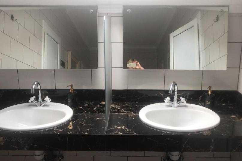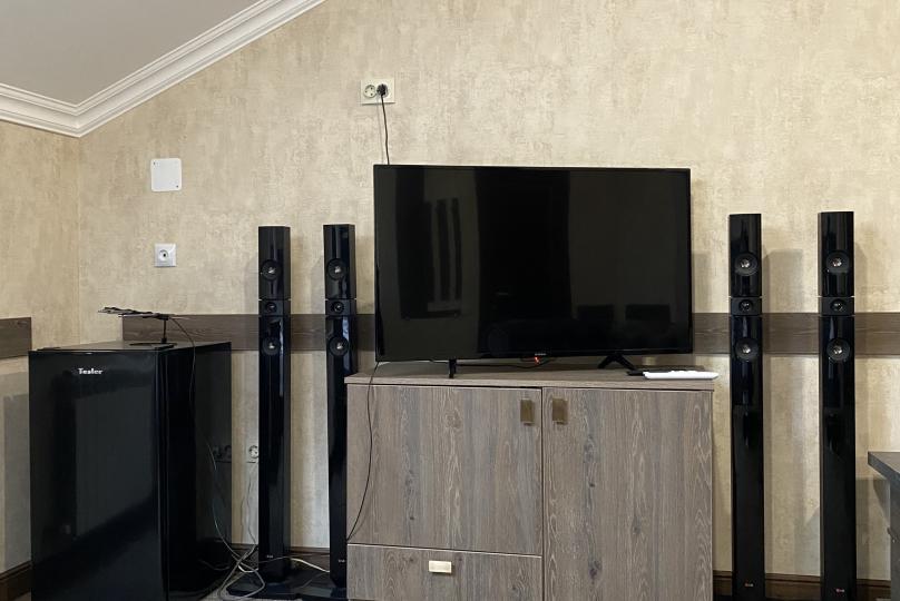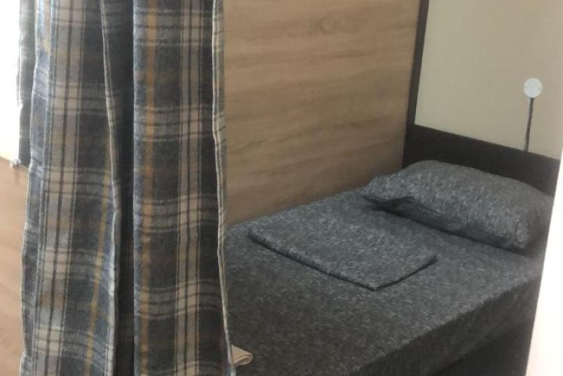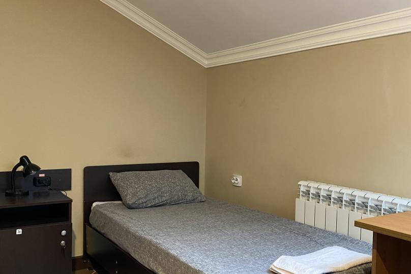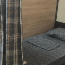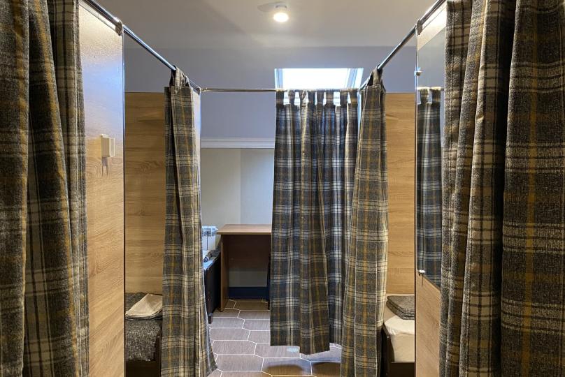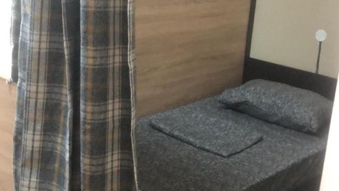 Номер площадью 30 квадратных метров разделен 6 индивидуальными отсеками с одноярусными кроватями. Качественный ремонт, индивидуальные лампы для чтения, розетки для подзарядки, тумбочки с замком, полотенца. Санузел: два туалета, две душевые, два умывальника, фен, стиральная машинка, гладильная доска, утюг. Просторная и светлая кухня-гостинная с панорамными окнами, холодильник, свч печь, кулер, столовая посуда, телевизор и диван.