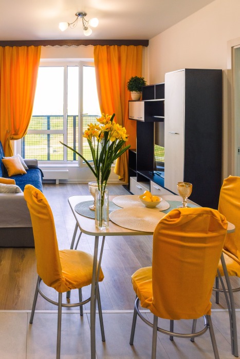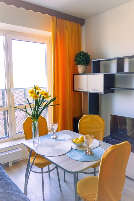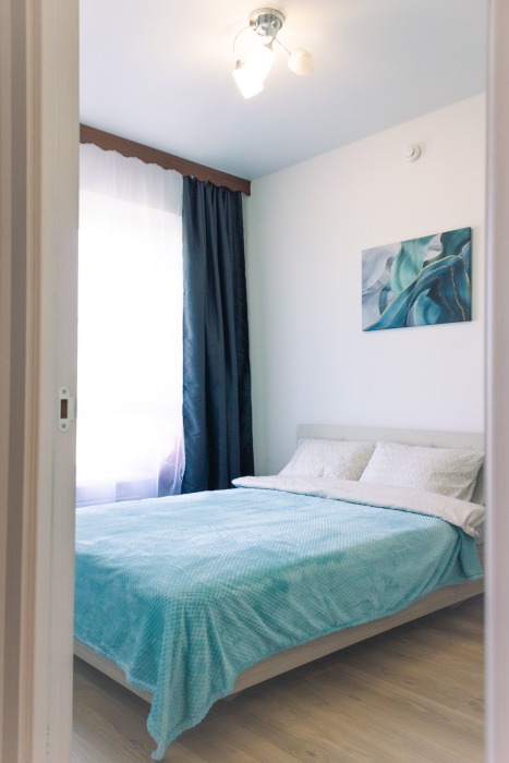 - Квартира светлая и просторная, размещаем до 4 человек. Имеется два раздельных спальных места - одна удобная двуспальная кровать и двуспальный диван;