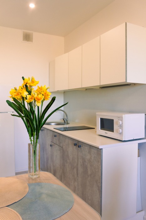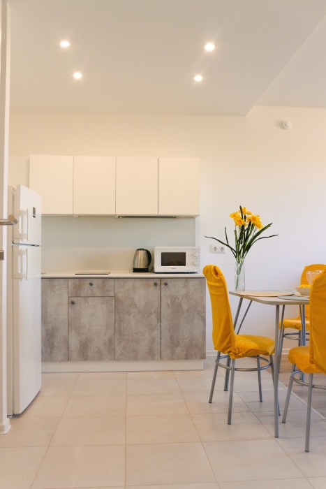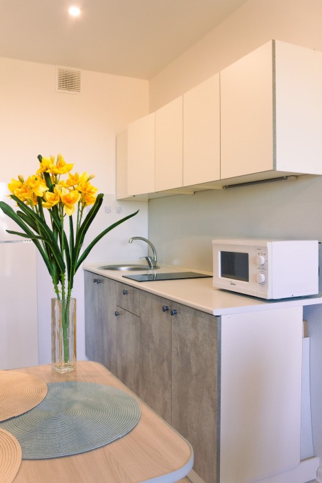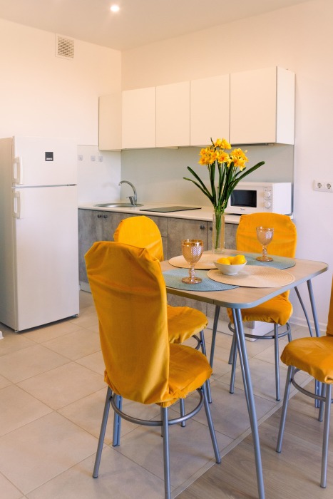 - Укомплектованная кухонная зона - столовые приборы, посуда, чай, кофе, сахар, масло;
