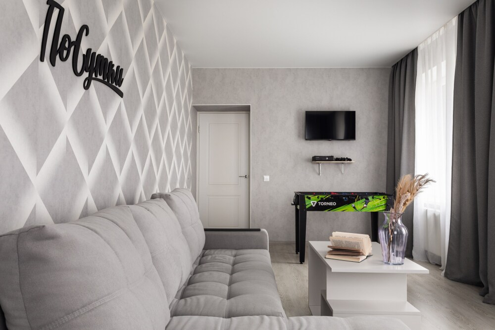 В квартире с комфортом могут разместиться четыре человека. В квартире есть: настольный футбол, две застекленные лоджии, гостиная зона, велосипед для прогулок, фен, телевизор с кабельными каналами. Кухня оснащена: холодильником, плитой, электрическим чайником, микроволновой печью, чай, кофе, сахар, соль, перец, подсолнечное масло всегда в наличии.