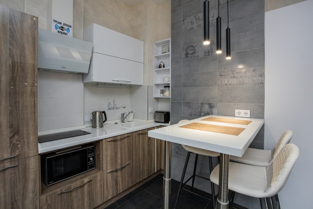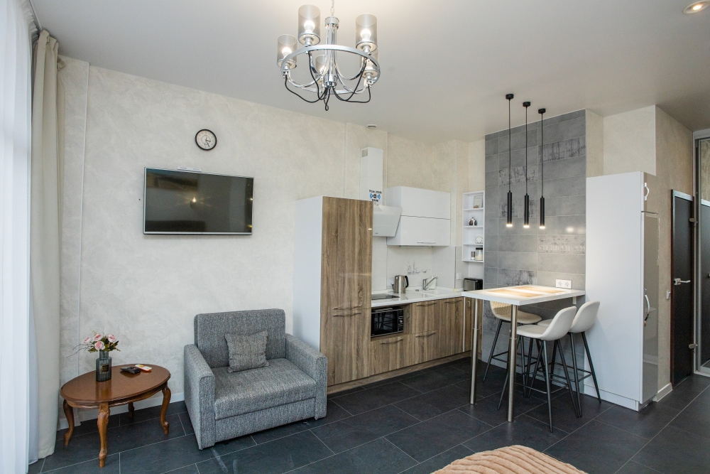 В квартире с комфортом могут разместиться три человека. В квартире есть: фен, телевизор с кабельными каналами, кондиционер. Кухня оснащена: холодильником, плитой, электрическим чайником, микроволновой печью, тостером, чай, кофе, сахар, соль, перец, подсолнечное масло всегда в наличии.