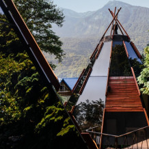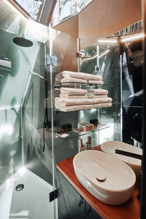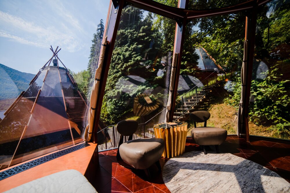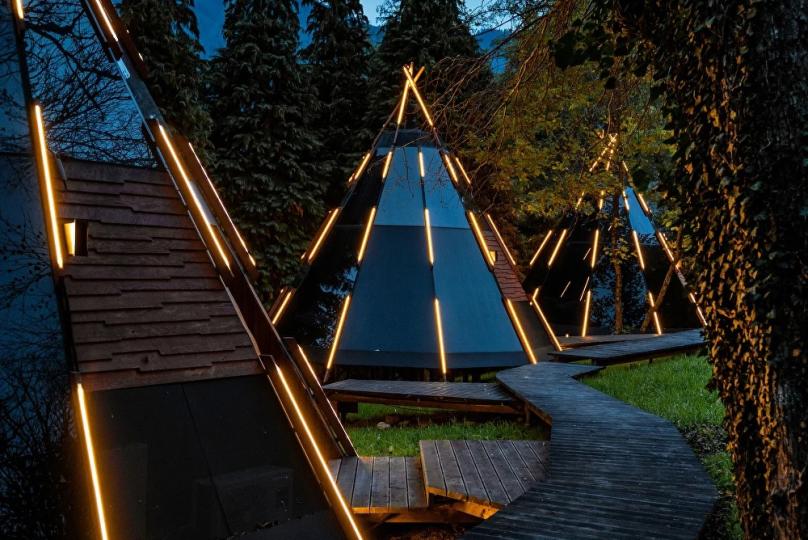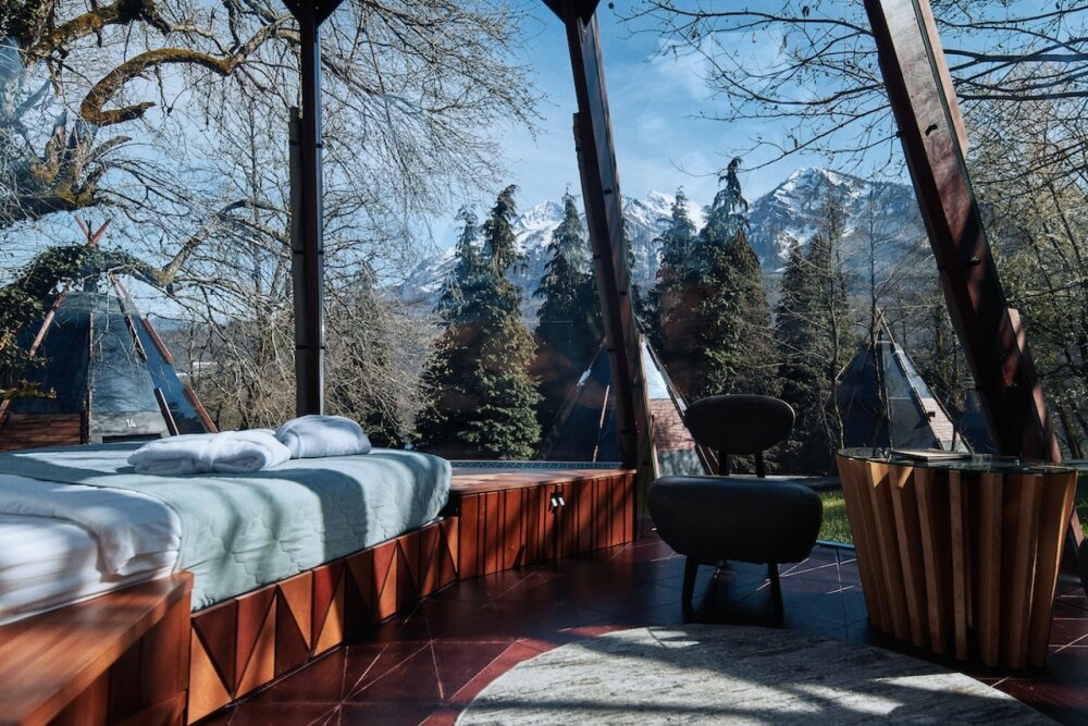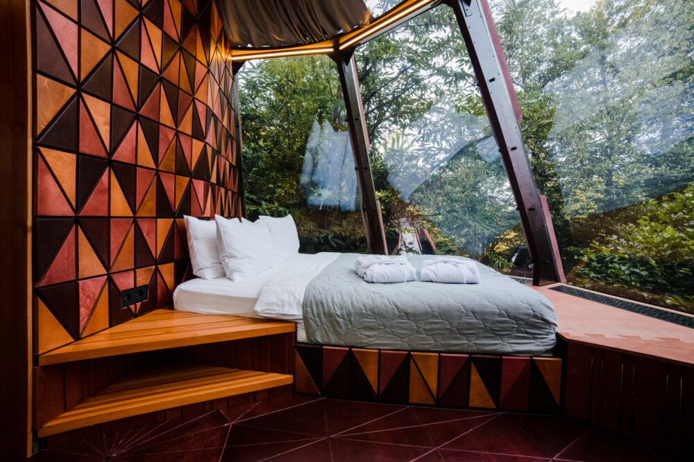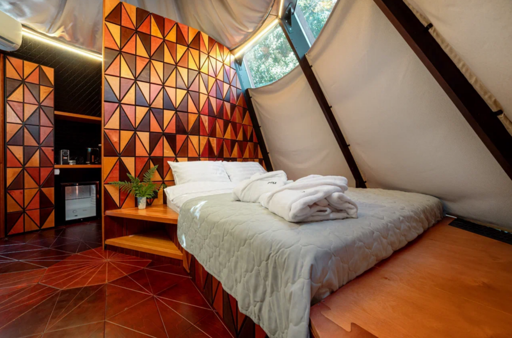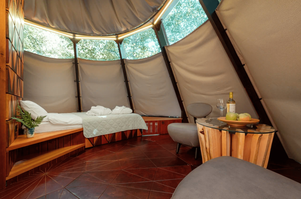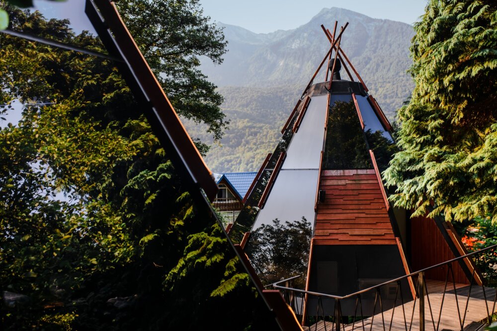 Номерной фонд отеля состоит из 27 домиков НеоТипи и в каждом из них эксклюзивный интерьер. Внутреннее оформление, мебель и элементы декора с особой заботой и вдохновением подобраны дизайнерами. Сделали акцент на натуральных материалах, приятных фактурах и спокойных тонах. Все для того, чтобы с первых минут вы ощутили гармонию и чувство единения с природой. Домики оснащены местом для хранения вещей, кондиционером, Wi-Fi, столиком со стульями, мини-холодильником, чайником и ванной комнатой. Гостям предоставляются полотенца, тапочки, халаты и косметические принадлежности.