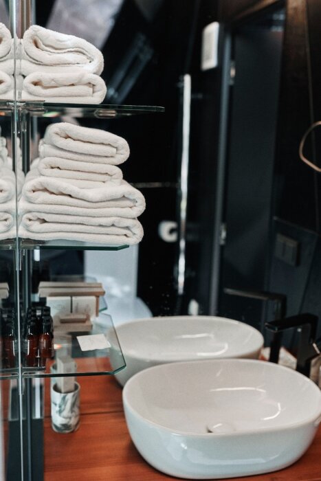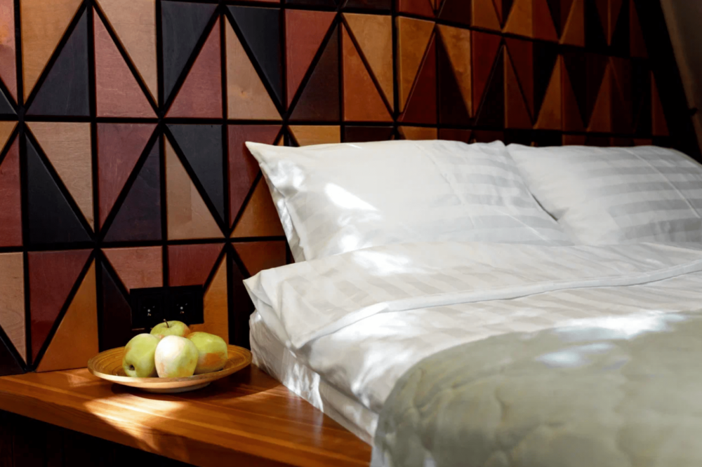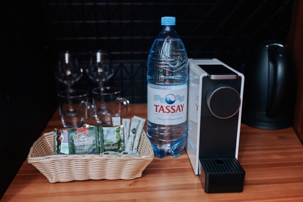 В номере есть все необходимое: жалюзи, чтобы добавить интимности моменту, просторная кровать с белоснежным бельем, ванная комната с наборами дизайнерской косметики Lia Lab, чайник, кофемашина и мини-бар.