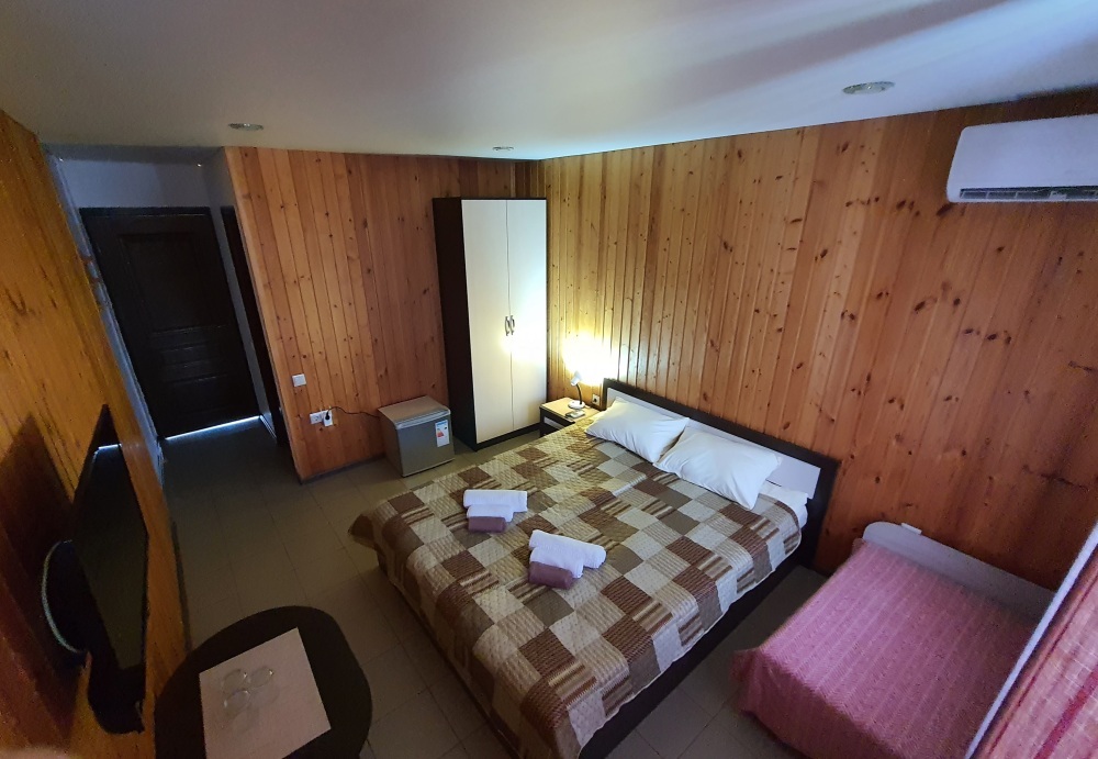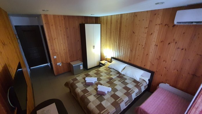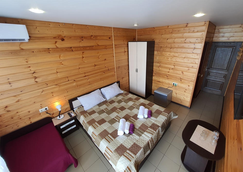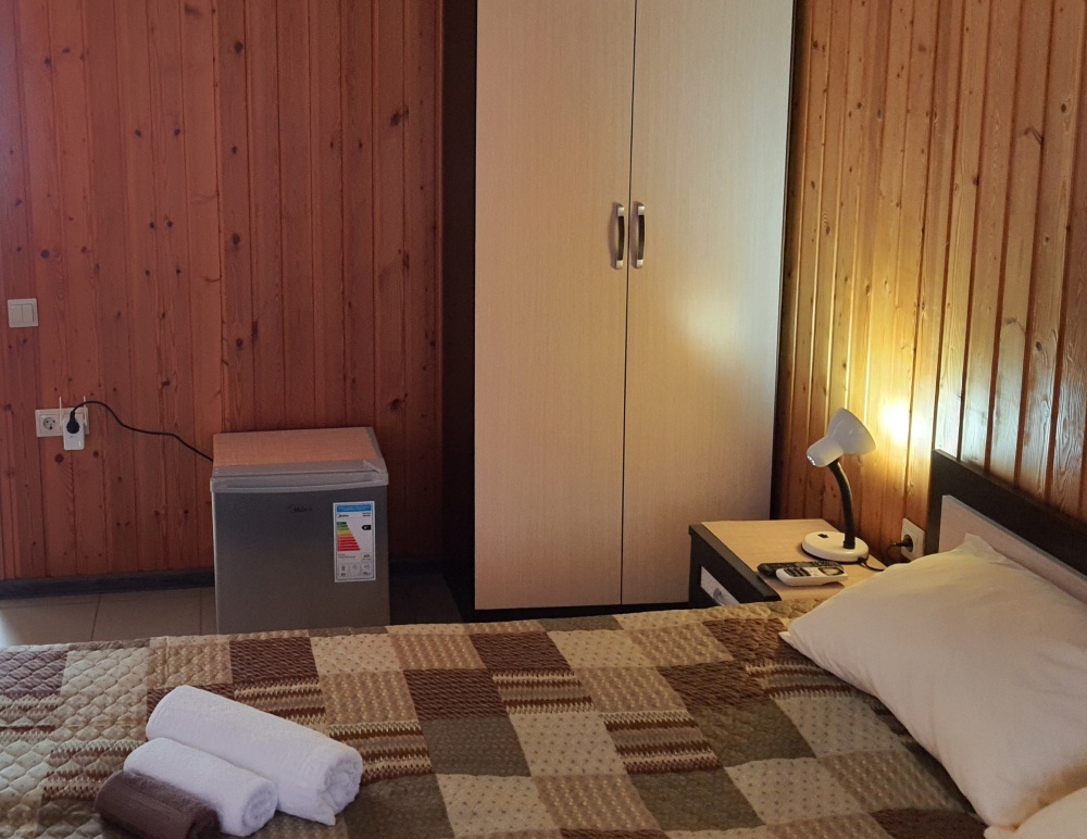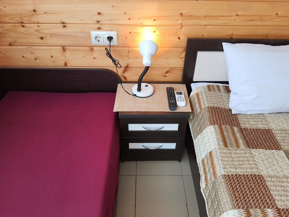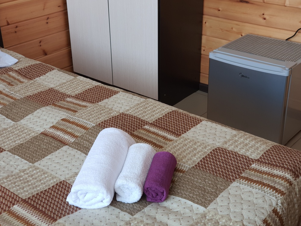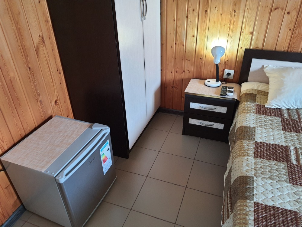 В каждом номере – шкаф, стол, тумбочка, телевизор, минихолодильник, кондиционер, бесплатный вайфай, душевая комната с туалетом (установлены водонагреватели), фен.