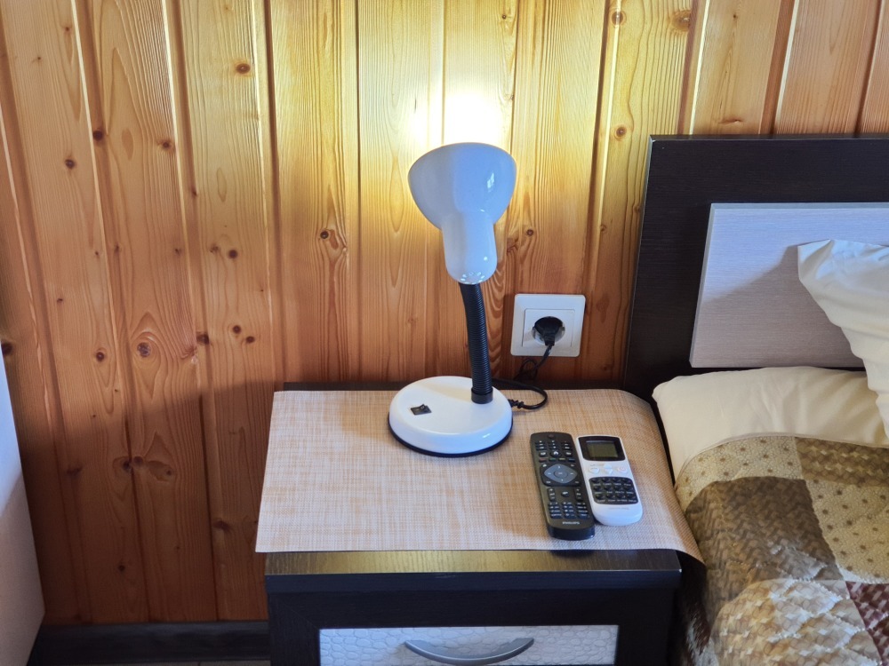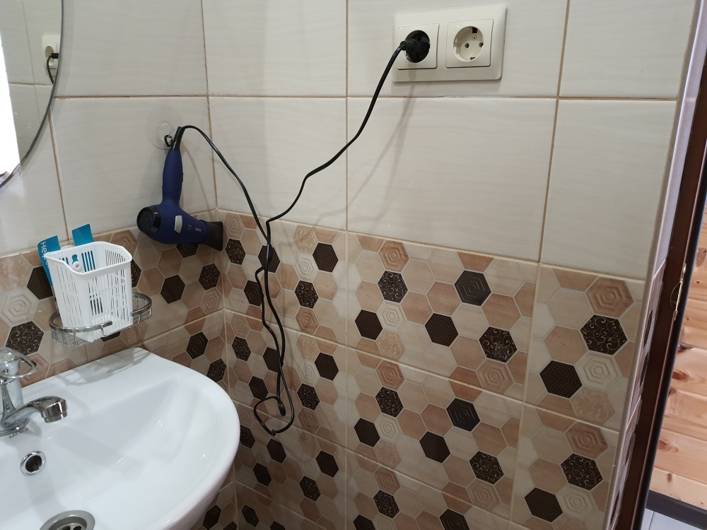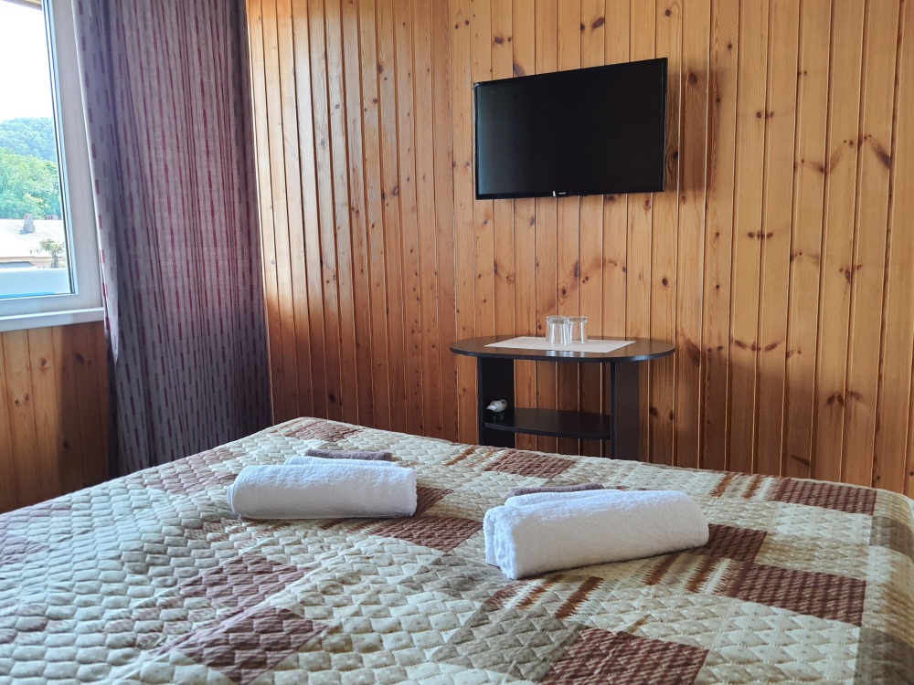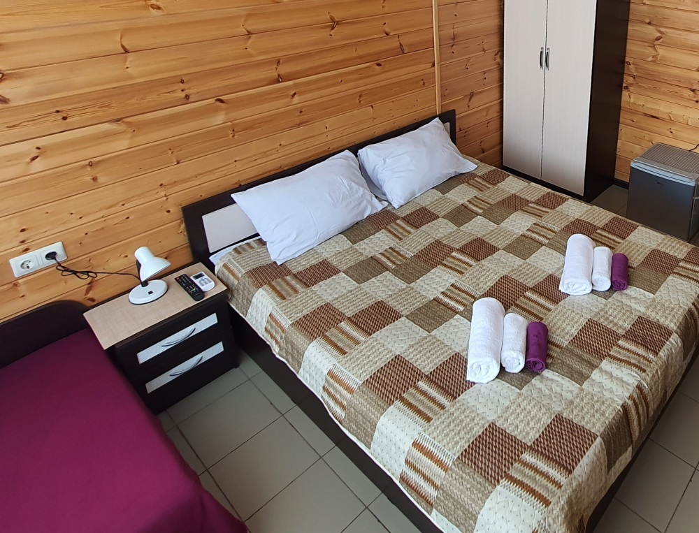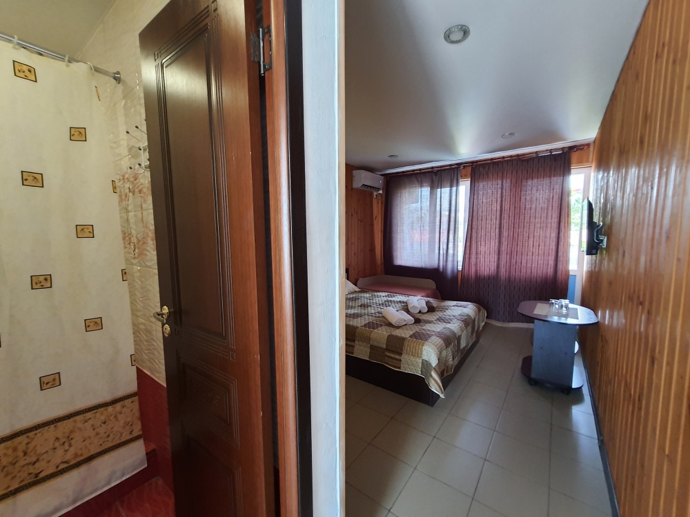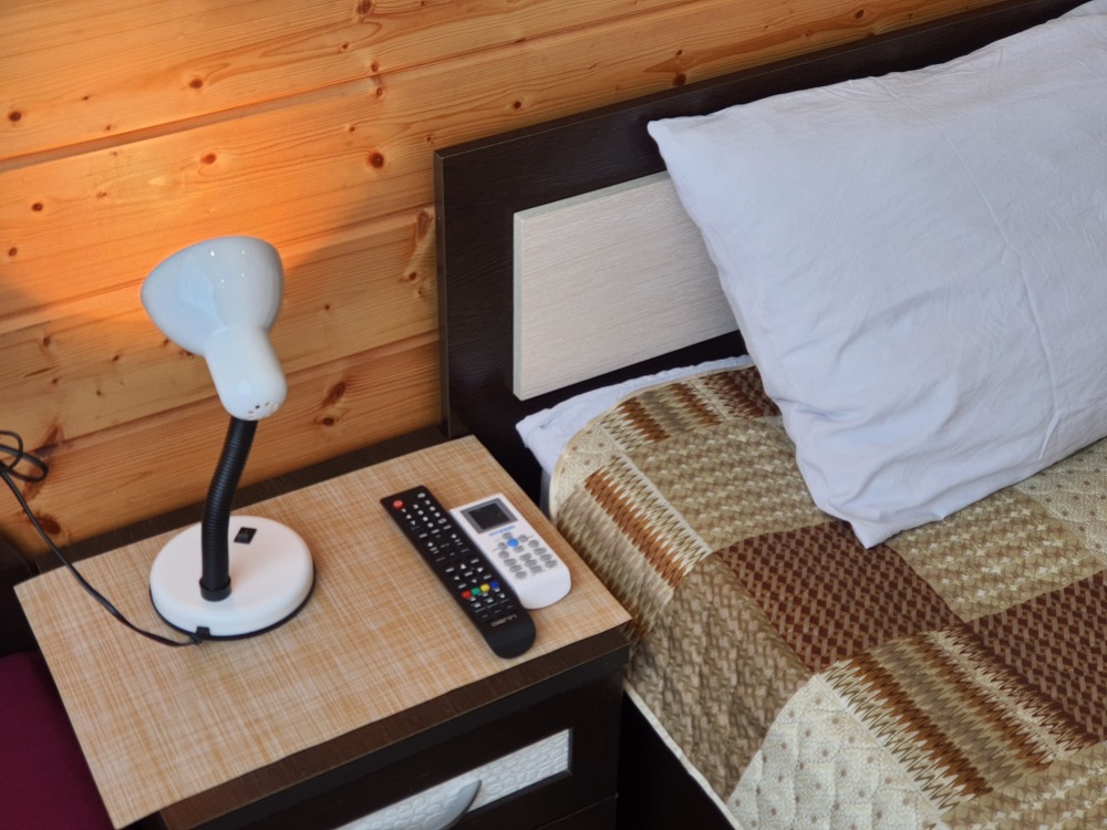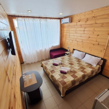 В каждом номере – шкаф, стол, тумбочка, телевизор, минихолодильник, кондиционер, бесплатный вайфай, душевая комната с туалетом (установлены водонагреватели), фен.