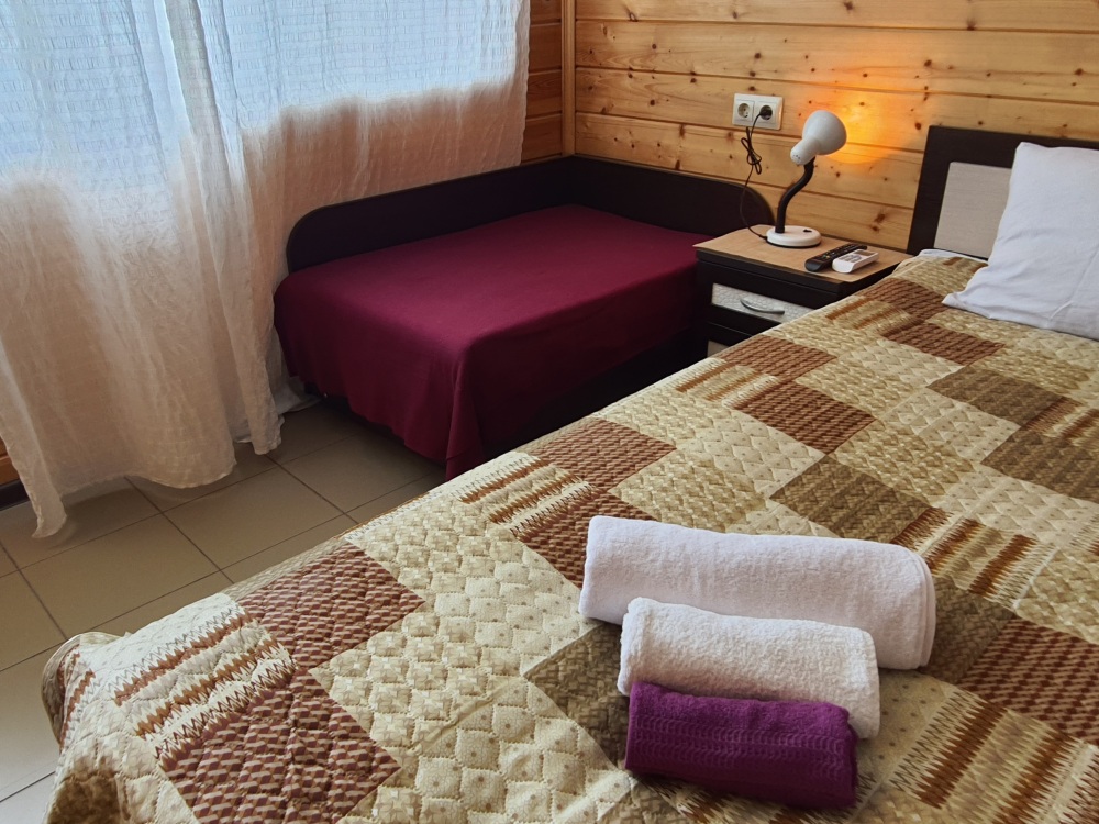 Комната укомплектована двуспальной кроватью с новым ортопедическим матрасом и небольшим диваном – всего три полноценных спальных места.