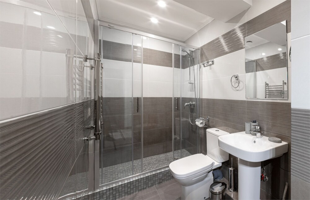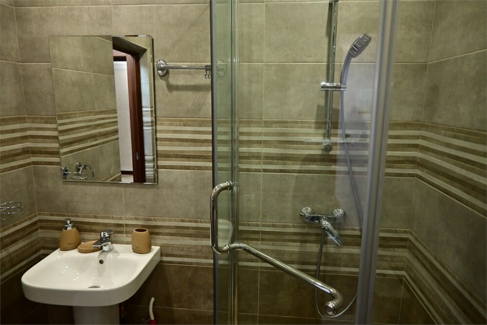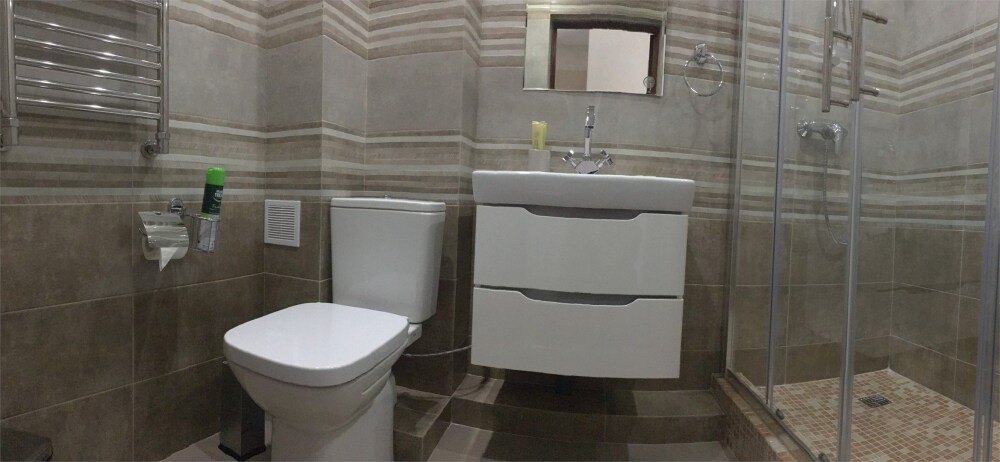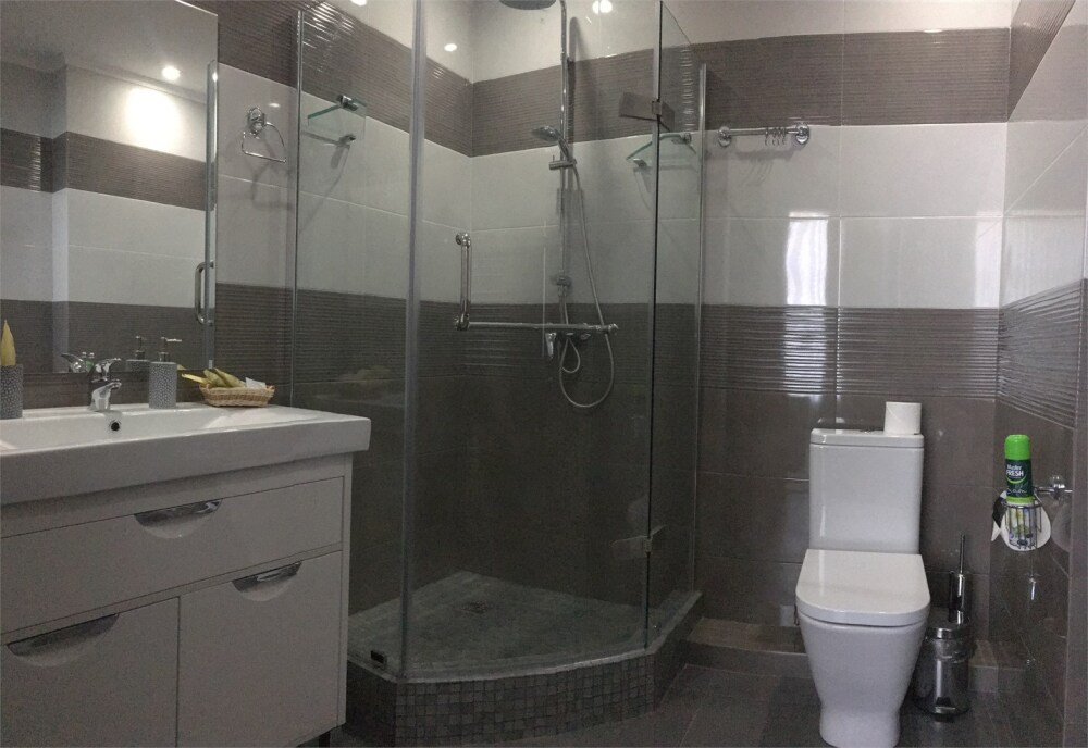 Просторный санузел оборудован душевой со стеклянным ограждением, а также имеется гигиенический душ.