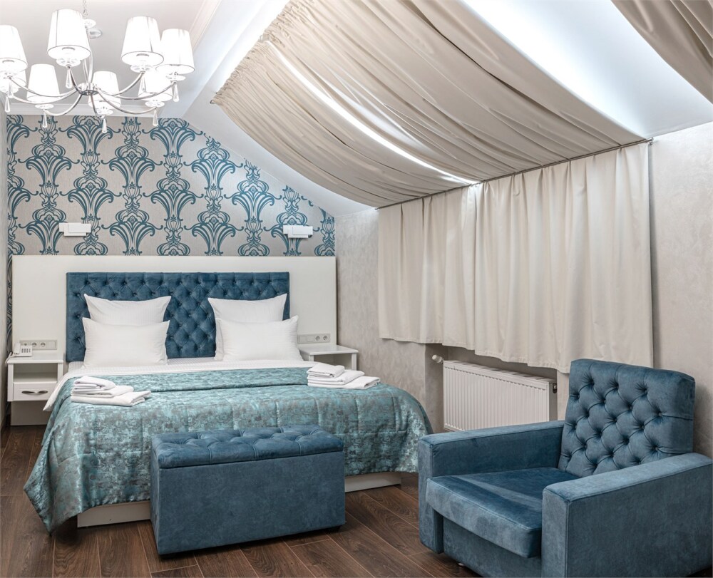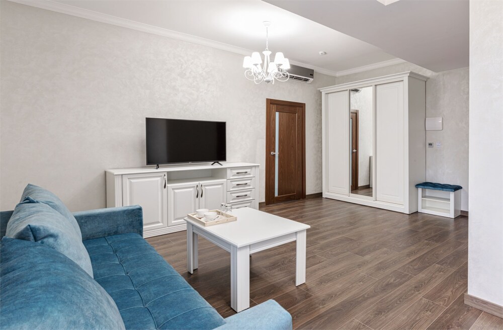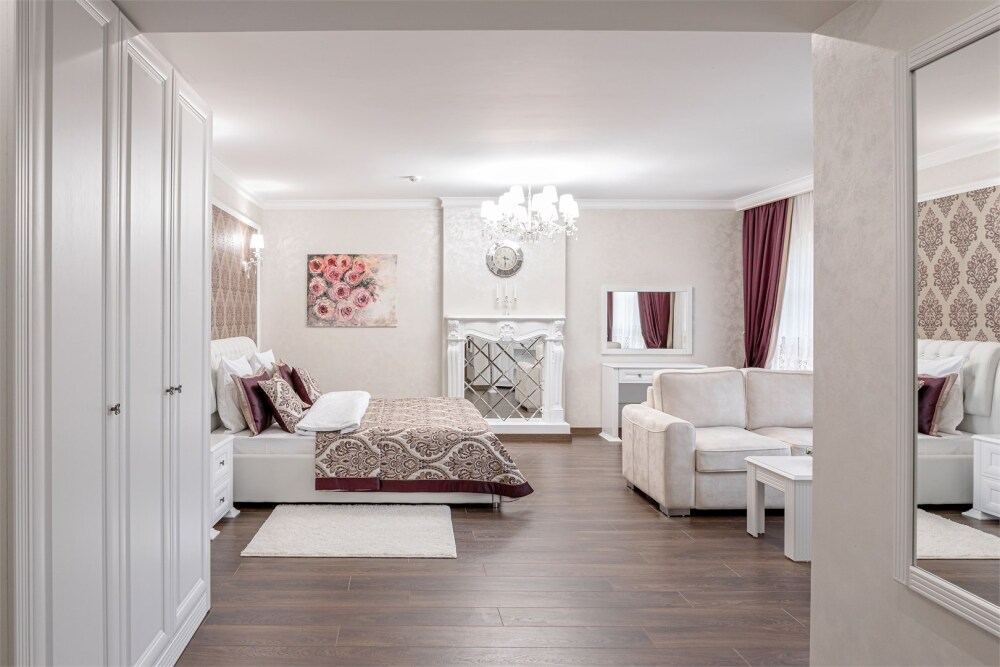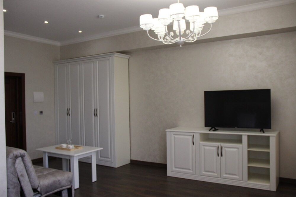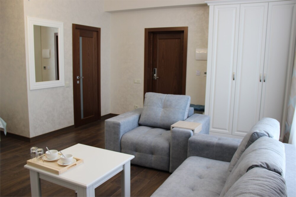 Однокомнатный номер повышенной комфортности площадью от 35 кв.м выбирают гости, предпочитающие идеальные условия проживания вне дома. Комната имеет условное зонирование на зону спальни и зону гостиной, оборудованную набором мягкой мебели. Просторный санузел оборудован душевой со стеклянным ограждением. В отделке номеров использованы современные гипоаллергенные материалы. Дизайн комнат и санузлов выполнен в теплых нейтральных тонах с аспектом на стильных деталях.