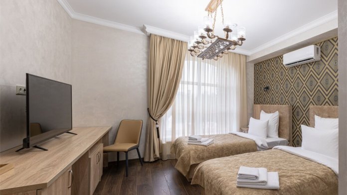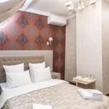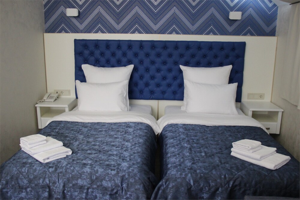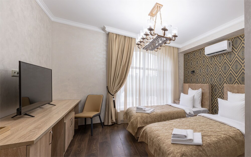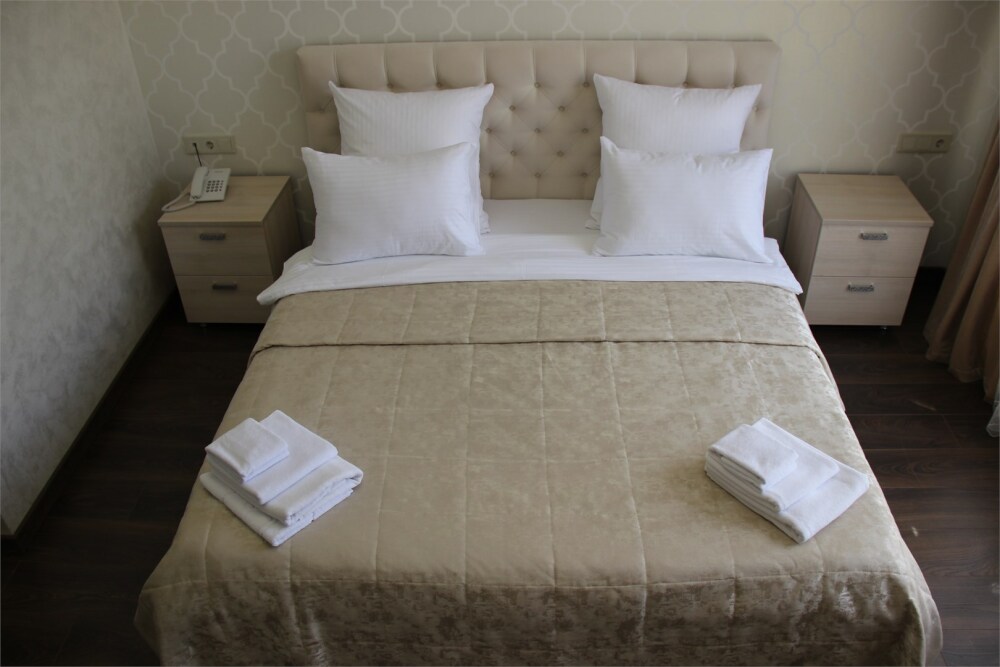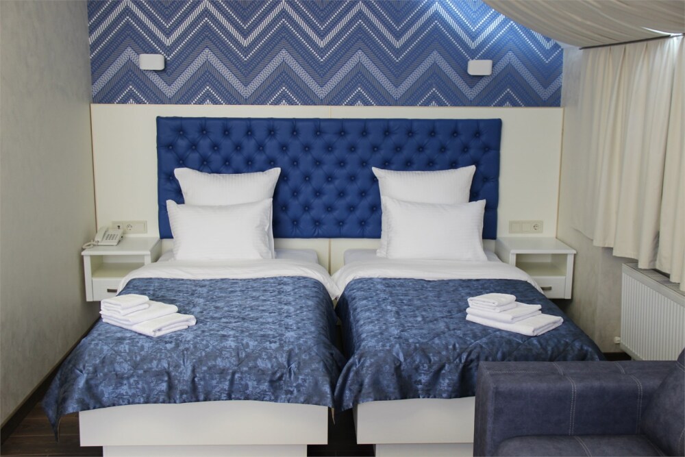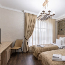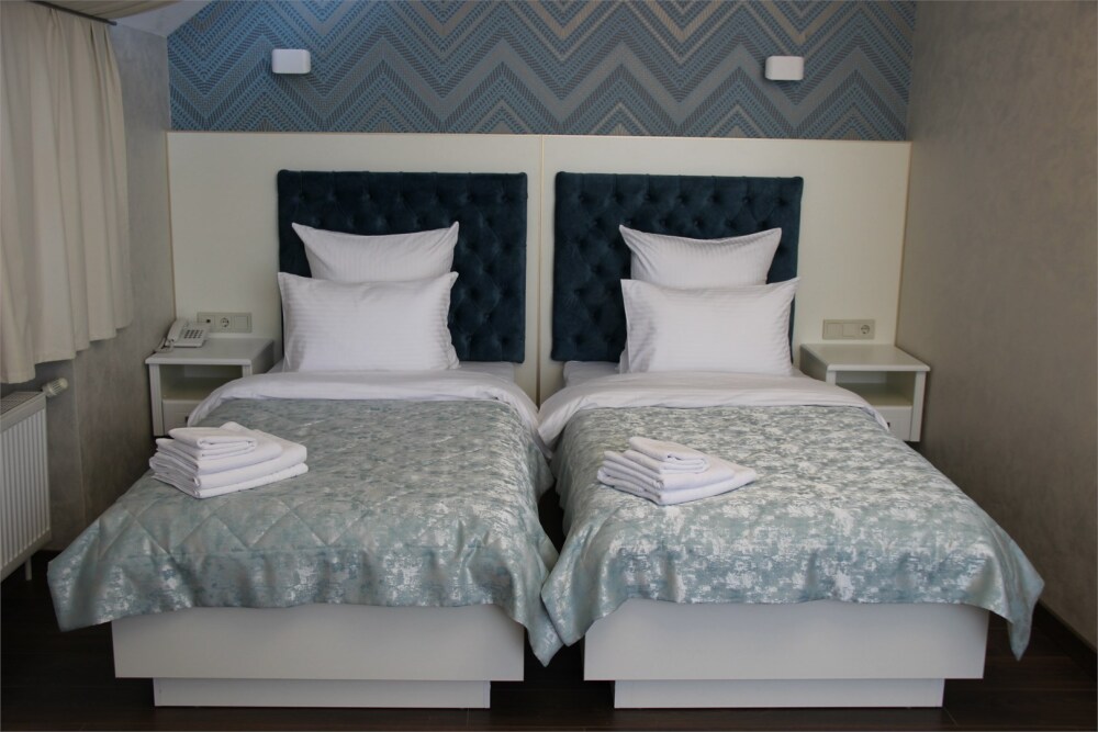 Классический стандартный 2-местный 1-комнатный номер площадью 18-22 кв.м предназначен для размещения 1 или 2 гостей. Номер оборудован всем необходимым для комфортного пребывания. Современная дизайнерская мебель создает ощущение изящества и уюта. Просторный санузел оборудован душевой со стеклянным ограждением, а также имеется гигиенический душ. В отделке номеров использованы современные гипоаллергенные материалы. Дизайн комнат и санузлов выполнен в теплых нейтральных тонах с аспектом на стильных деталях.
