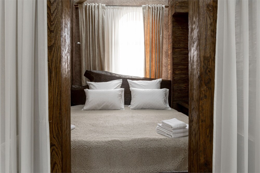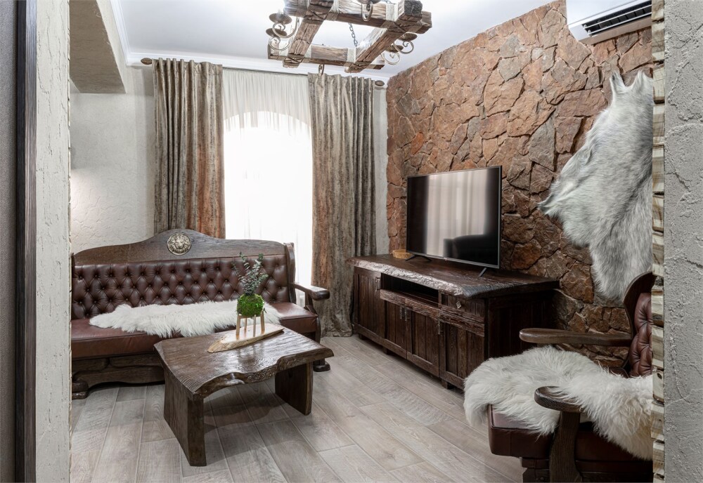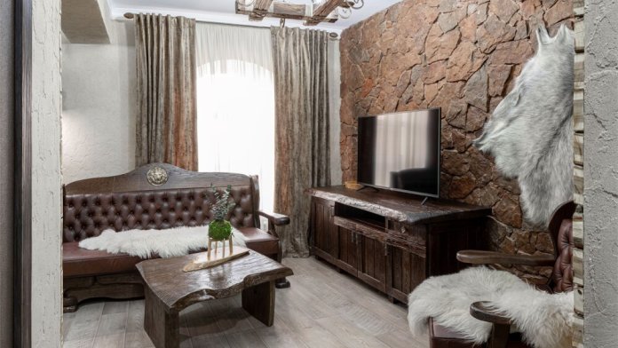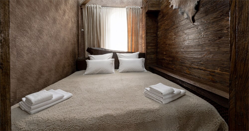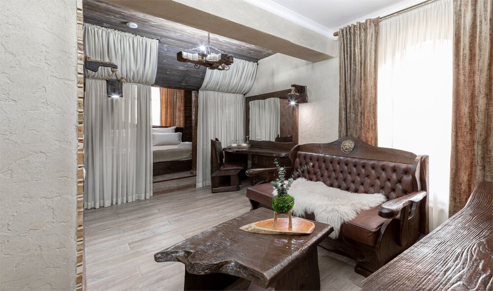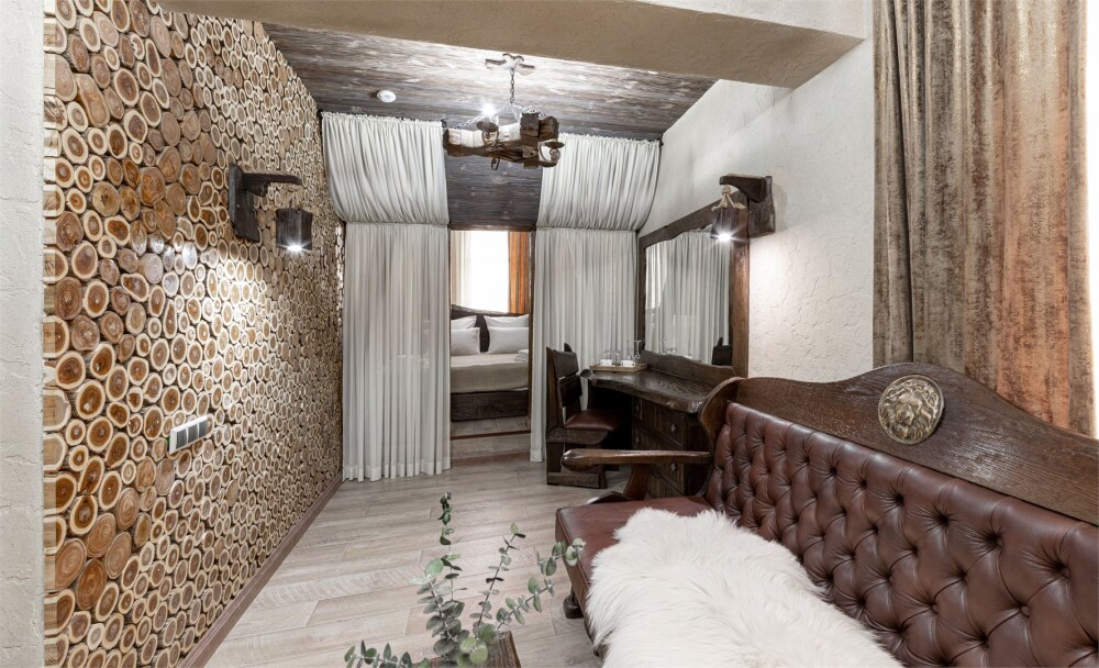 Дизайнерский люкс «Башня» - это воплощенная мечта для тех, кто ценит натуральные материалы в отделке помещения: дерево, кожа, натуральный мех. Дизайн комнаты безусловно понравится харизматичным мужчинами, а также произведет неизгладимое впечатление на взыскательных женщин. Мебель и предметы интерьера подобраны не только по стилю, но и по возможности полезного и удобного использования.