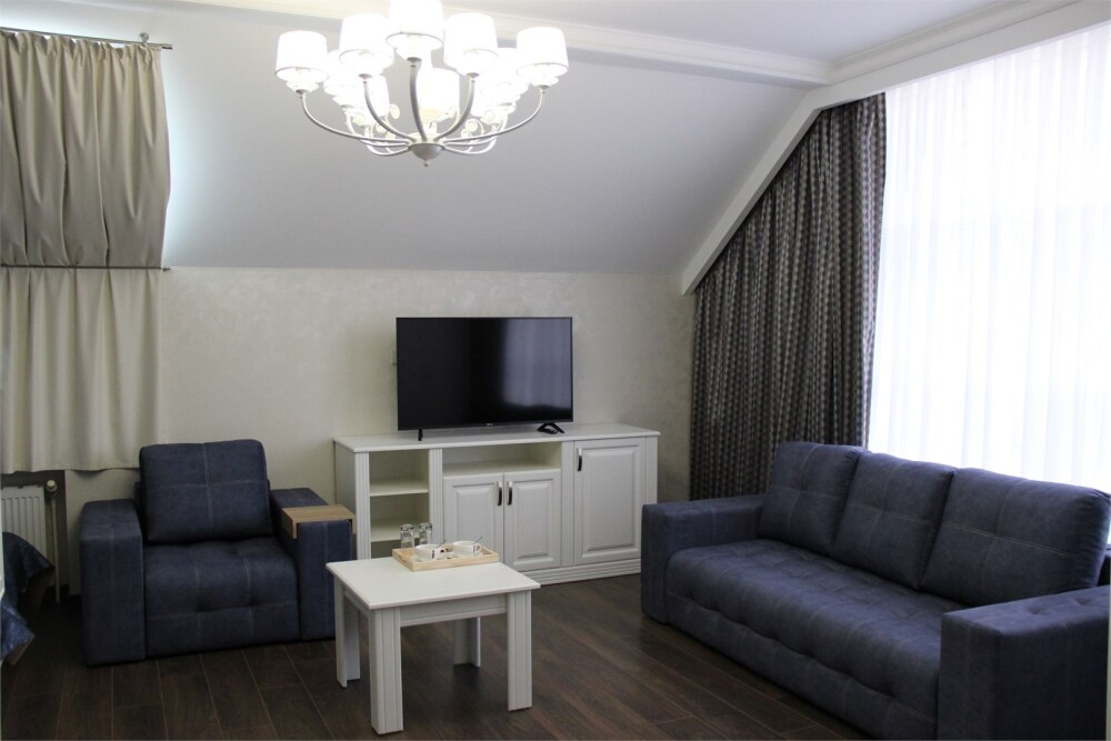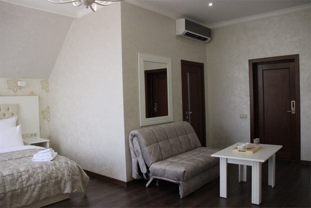 Классический 2-комнатный номер повышенного комфорта идеально подойдет как для размещения индивидуальных гостей, так и для семьи. Уютная стильная спальня подарит крепкий сон и прекрасное ощущение тепла и комфорта. Гостиная имеет выход на просторную индивидуальную террасу, где приятно посидеть с друзьями на свежем воздухе. Просторный санузел оборудован душевой со стеклянным ограждением, а также имеется гигиенический душ. В отделке номеров использованы современные гипоаллергенные материалы. Дизайн комнат и санузлов выполнен в теплых нейтральных тонах с аспектом на стильных деталях.