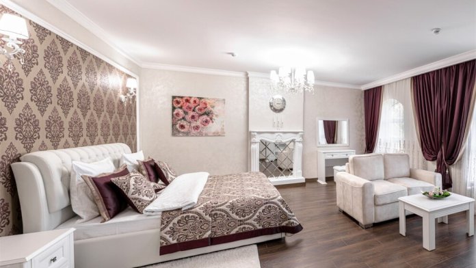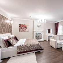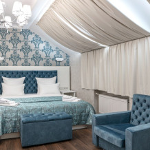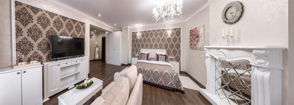 Уникальный дизайнерский номер станет идеальным подарком молодожёнам и романтическим парам в самый важный день в жизни. Преобладание белого цвета в отделке комнаты и мебели создает непревзойденное ощущение легкости, чистоты и торжества. Широкая кровать снабжена высококачественным матрасом и дополнена набором мягкой мебели с журнальным столиком. Тщательно подобранные детали отделки и интерьера отлично подойдут для частных и свадебных фото-сессий. Просторный санузел оборудован угловой ванной.