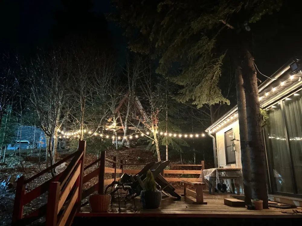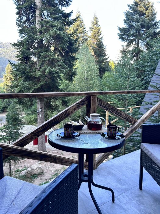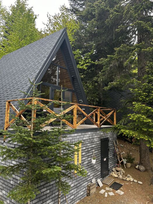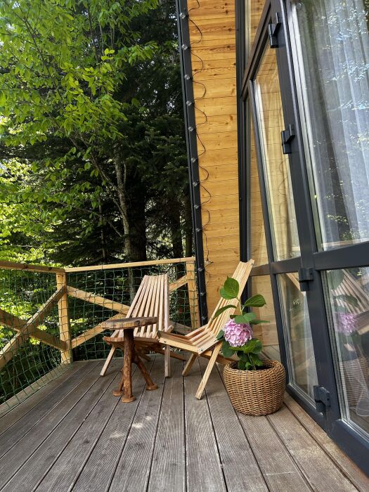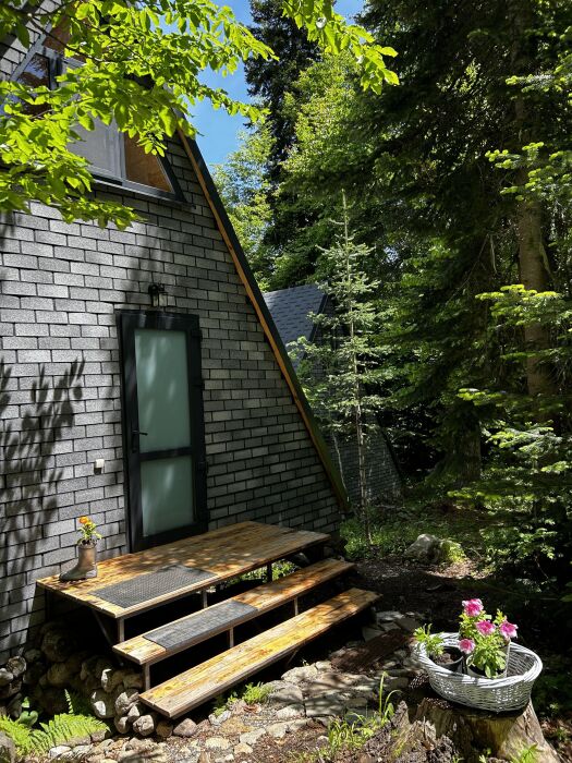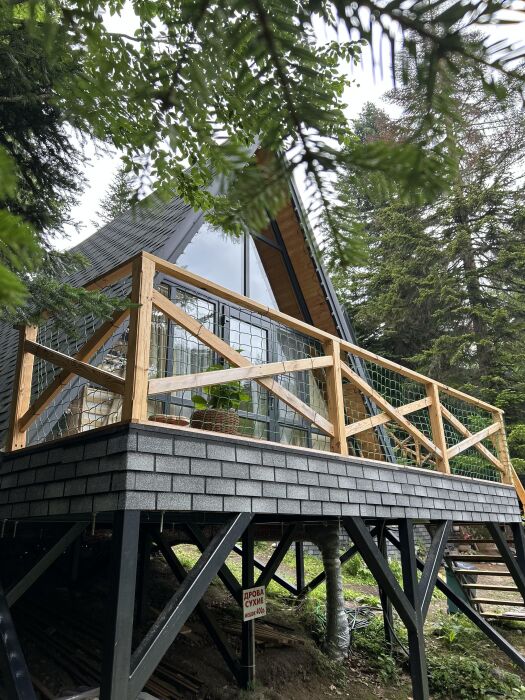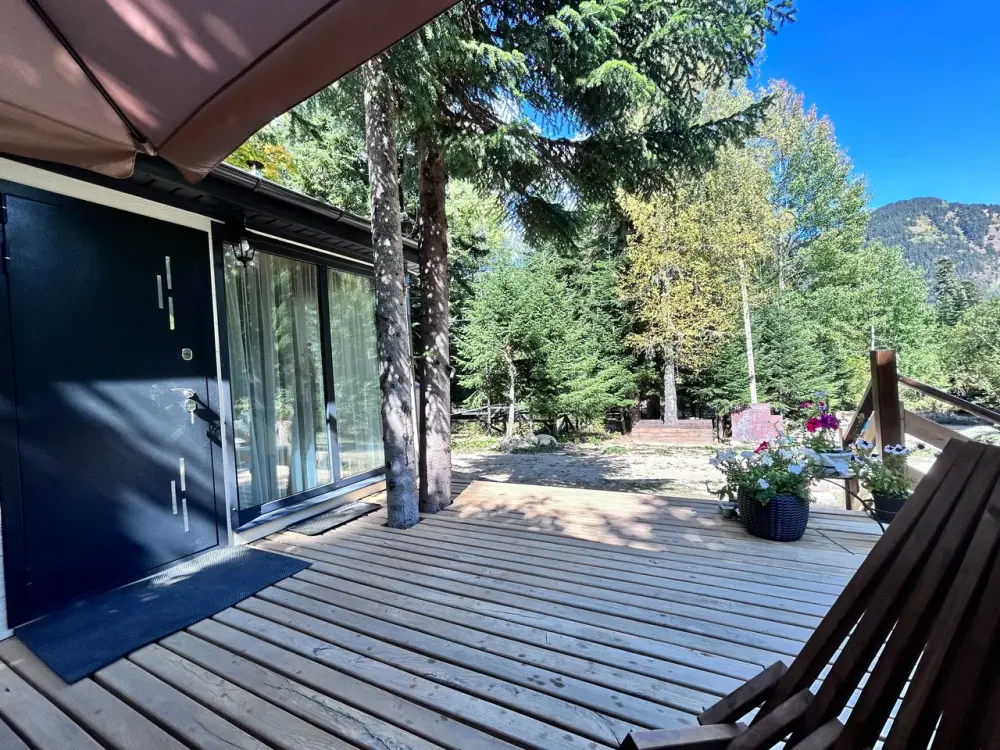 Снаружи А-фрейма есть просторная терраса, где Вы сможете наслаждаться свежим воздухом и панорамными видами на горы. Здесь Вы можете проводить время с друзьями или семьей, готовить шашлык на гриле или просто наслаждаться уютной атмосферой.