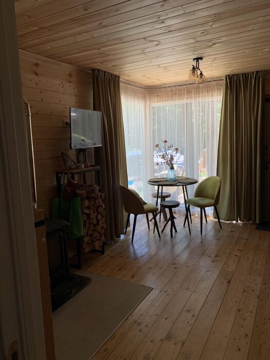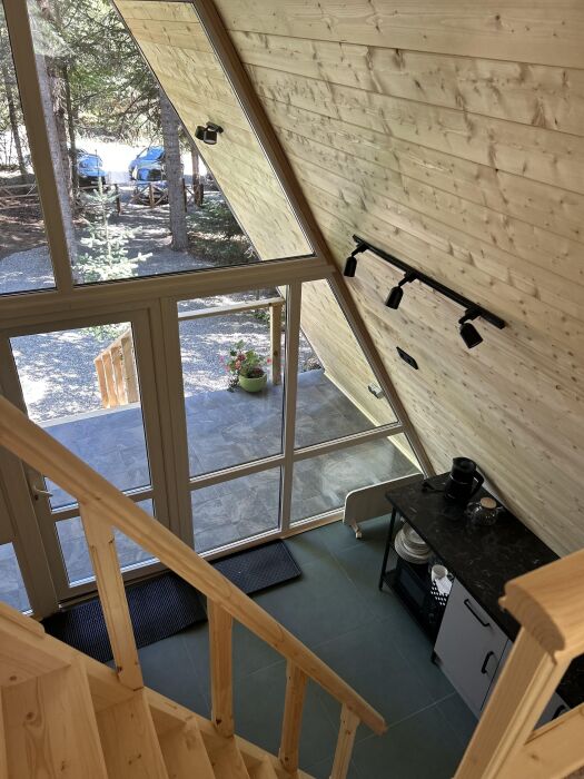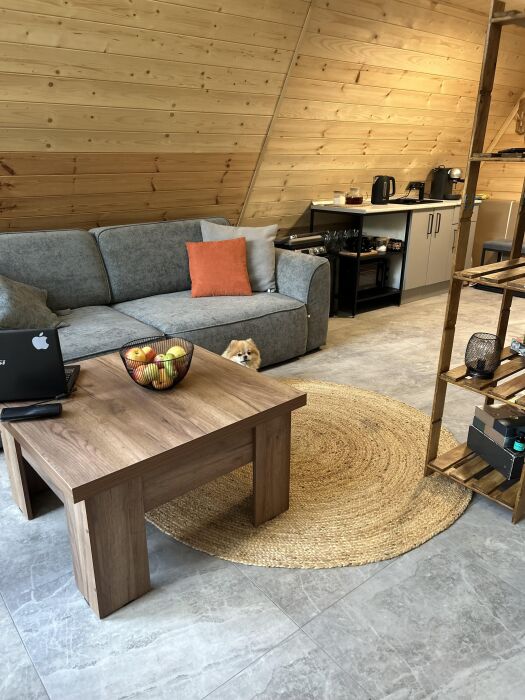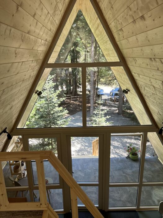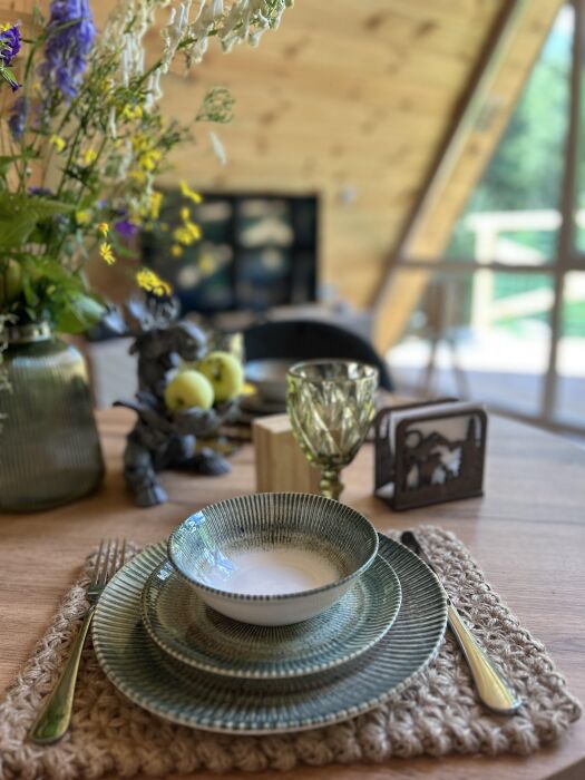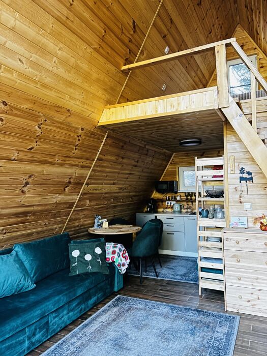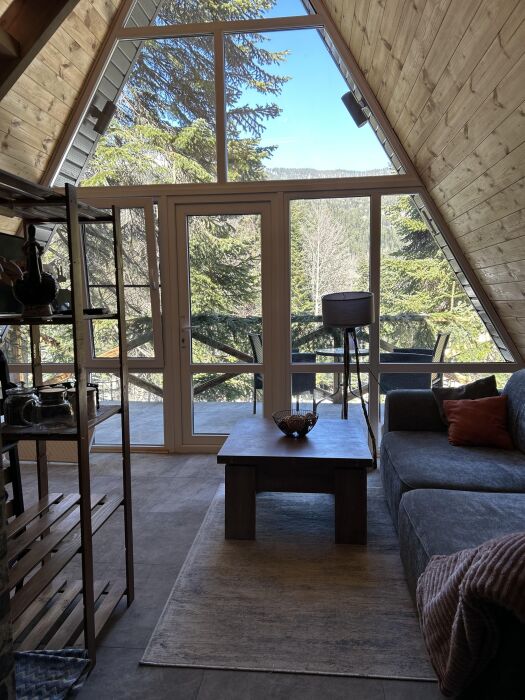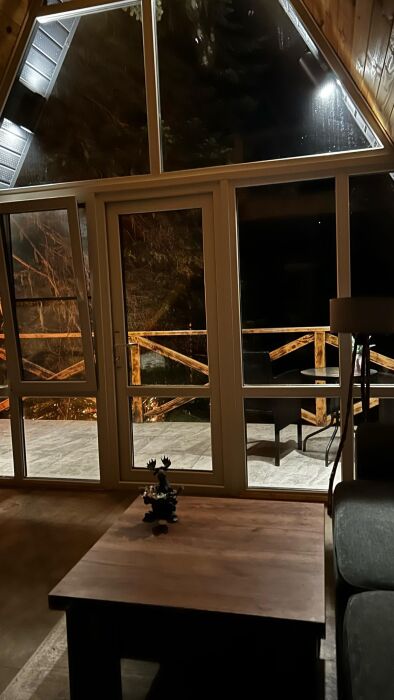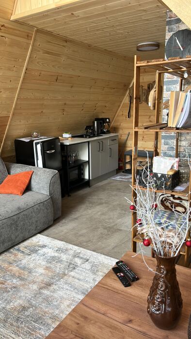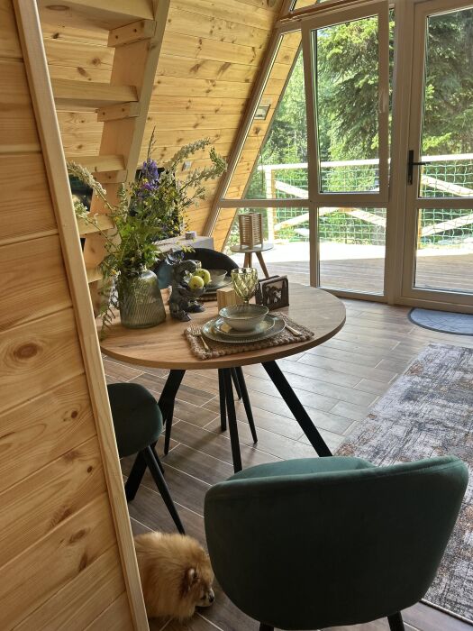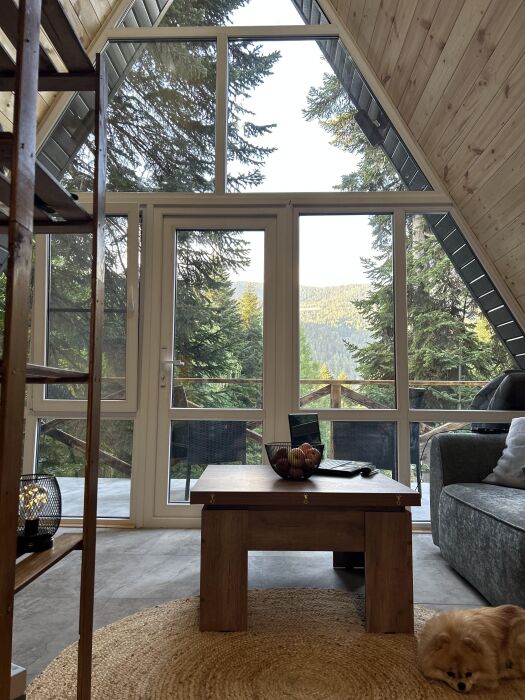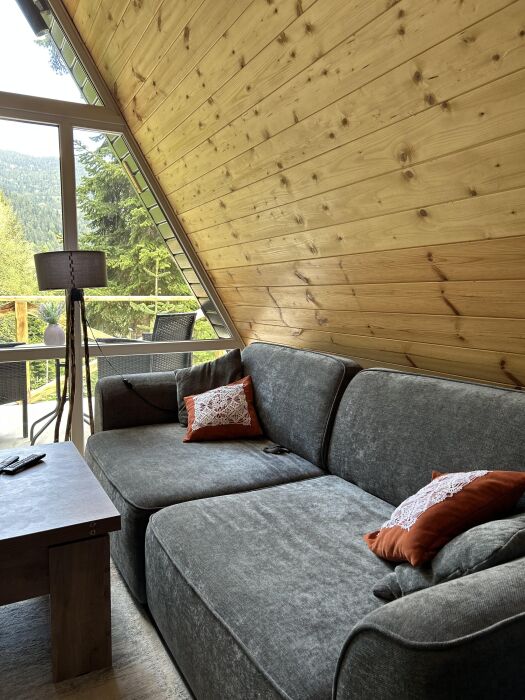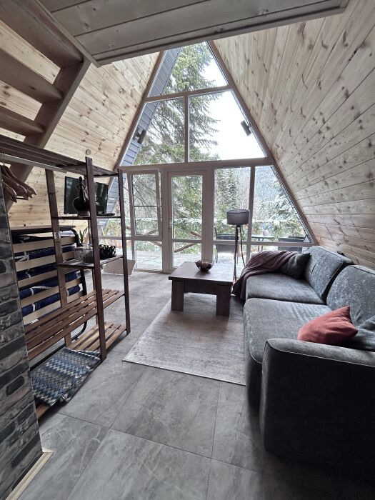 Внутри А-фрейма Вы найдете просторную гостиную с большими панорамными окнами, открывающими потрясающий вид на горы. Здесь Вы сможете расслабиться на комфортабельном диване и насладиться просмотром любимого кинофильма в прохладные вечера. Кухня полностью оборудована всем необходимым для приготовления пищи, и Вы сможете наслаждаться вкусными блюдами в просторной столовой.