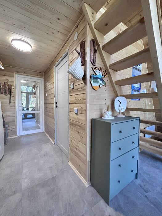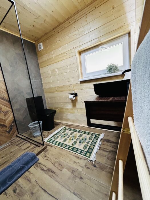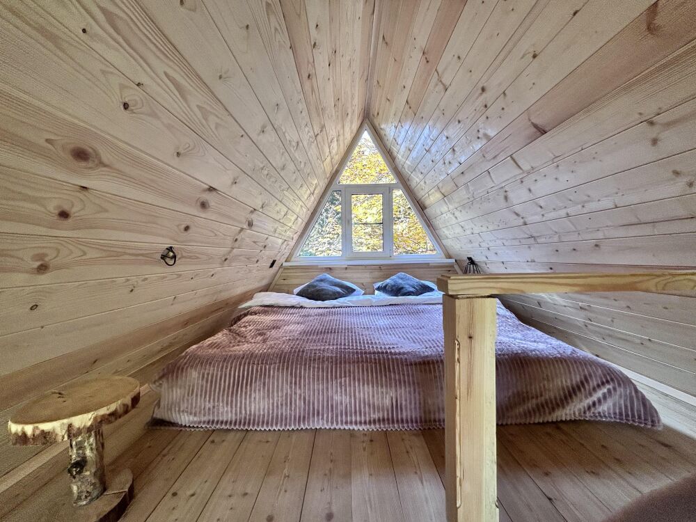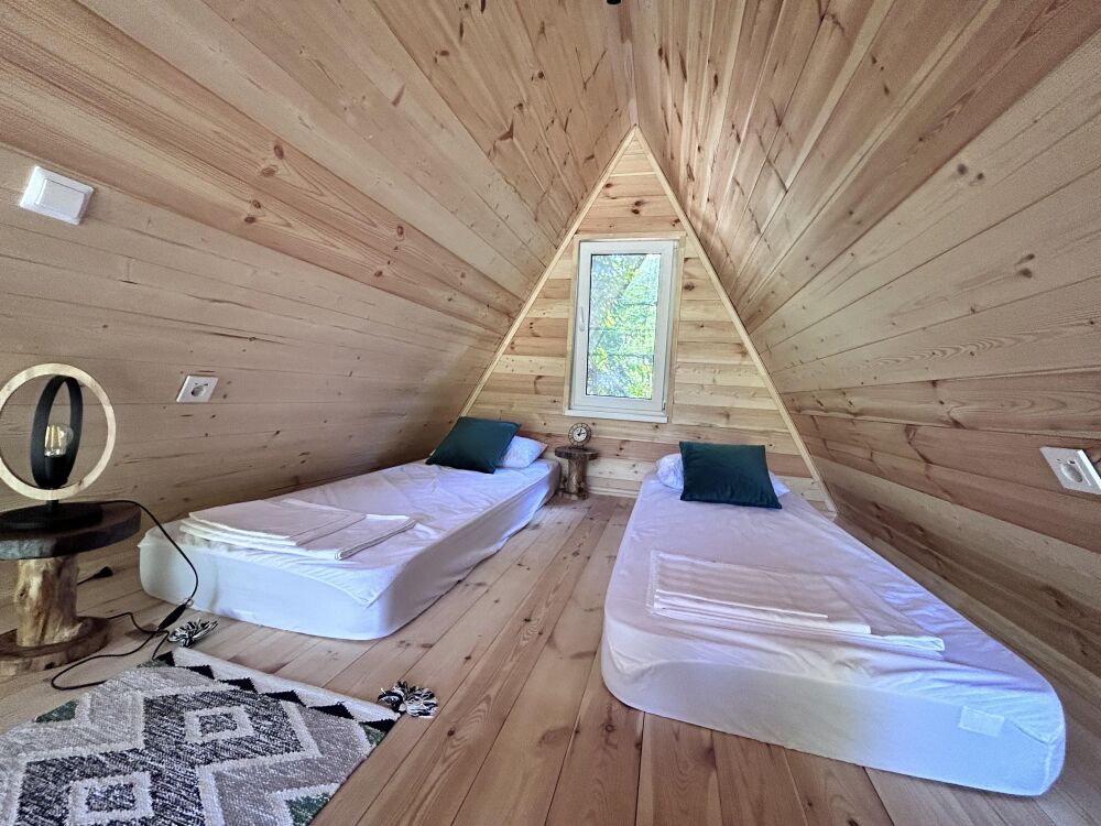 Второй этаж в доме в виде антресоли с комфортными ортопедическими матрасами, чтобы обеспечить Вам отличный сон после долгого дня активного времяпрепровождения. Ванная комната оборудована современными удобствами, чтобы Вы могли расслабиться и освежиться.